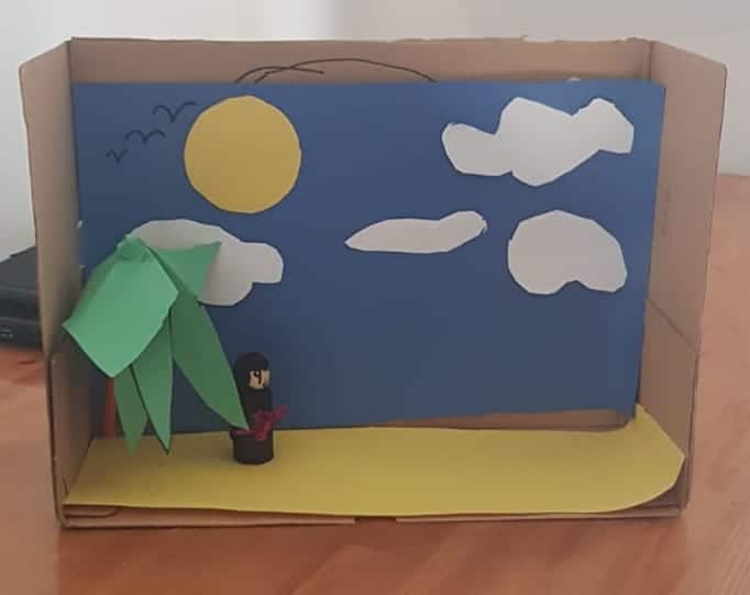 ‘I writed colours, tree, coconut, dark white sand, blue and sandy.’