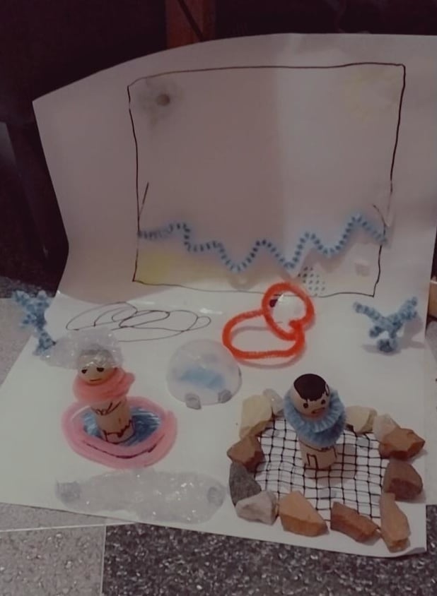 ‘This is me in the water I was curly and living in a land. So this is Curly Koala and this is the water in this land. This is the sun and these are the trees, and a picnic with stones round it. I used stones because I’ve been getting them from outside!’