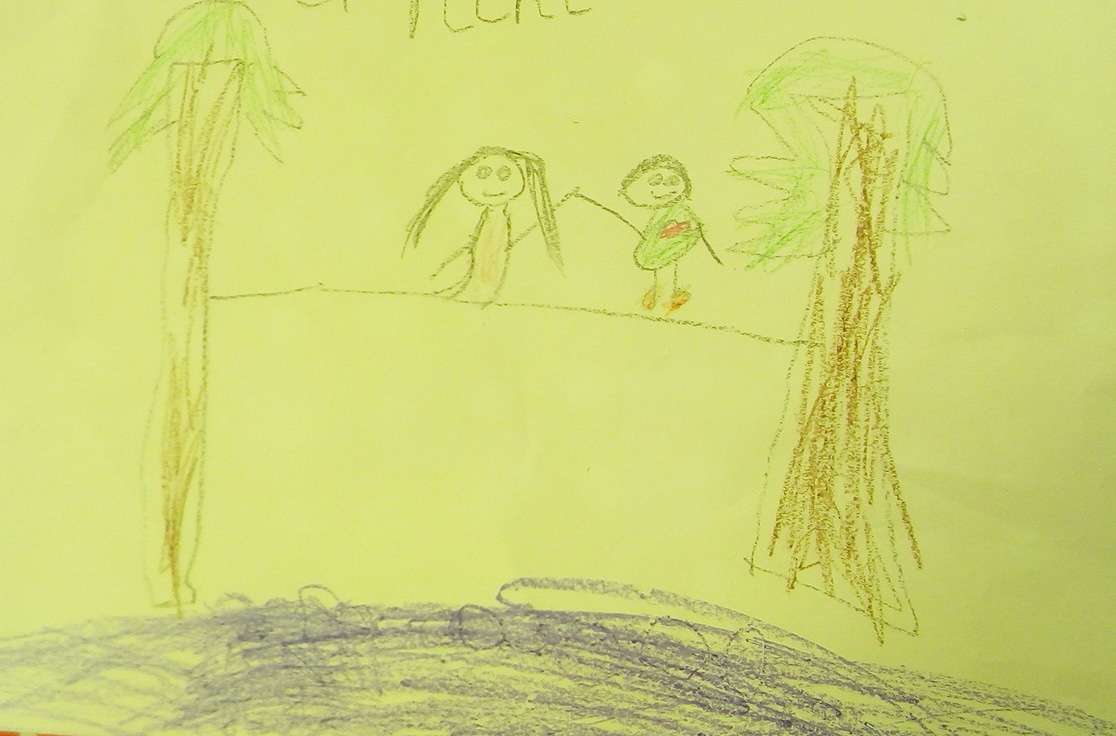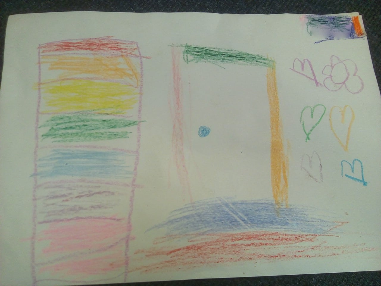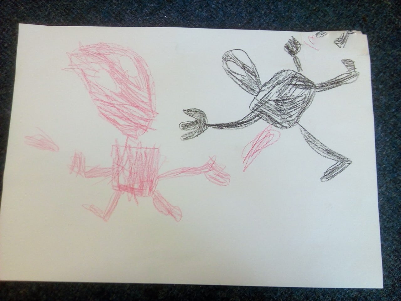 “That’s me practising my moves that’s the school and that’s my house. That’s the teacher and children. 2ND DRAWING: Me when I am an old man and I got a pirate ship.” P1A