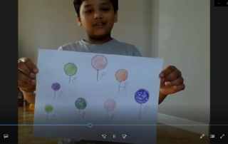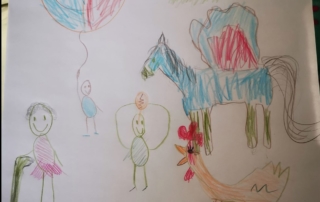 We flew over Glasgow on our Flying Balloons and we saw a silvery snake that turn out to be the River Clyde! And we saw a purple whale and an angry bird that became a happy bird cause we blew it a kiss. We saw the schools empty of children but with blooming flowers. We saw a pirate ship and a black pigeon and a frog AND a waterfall made of chocolate!