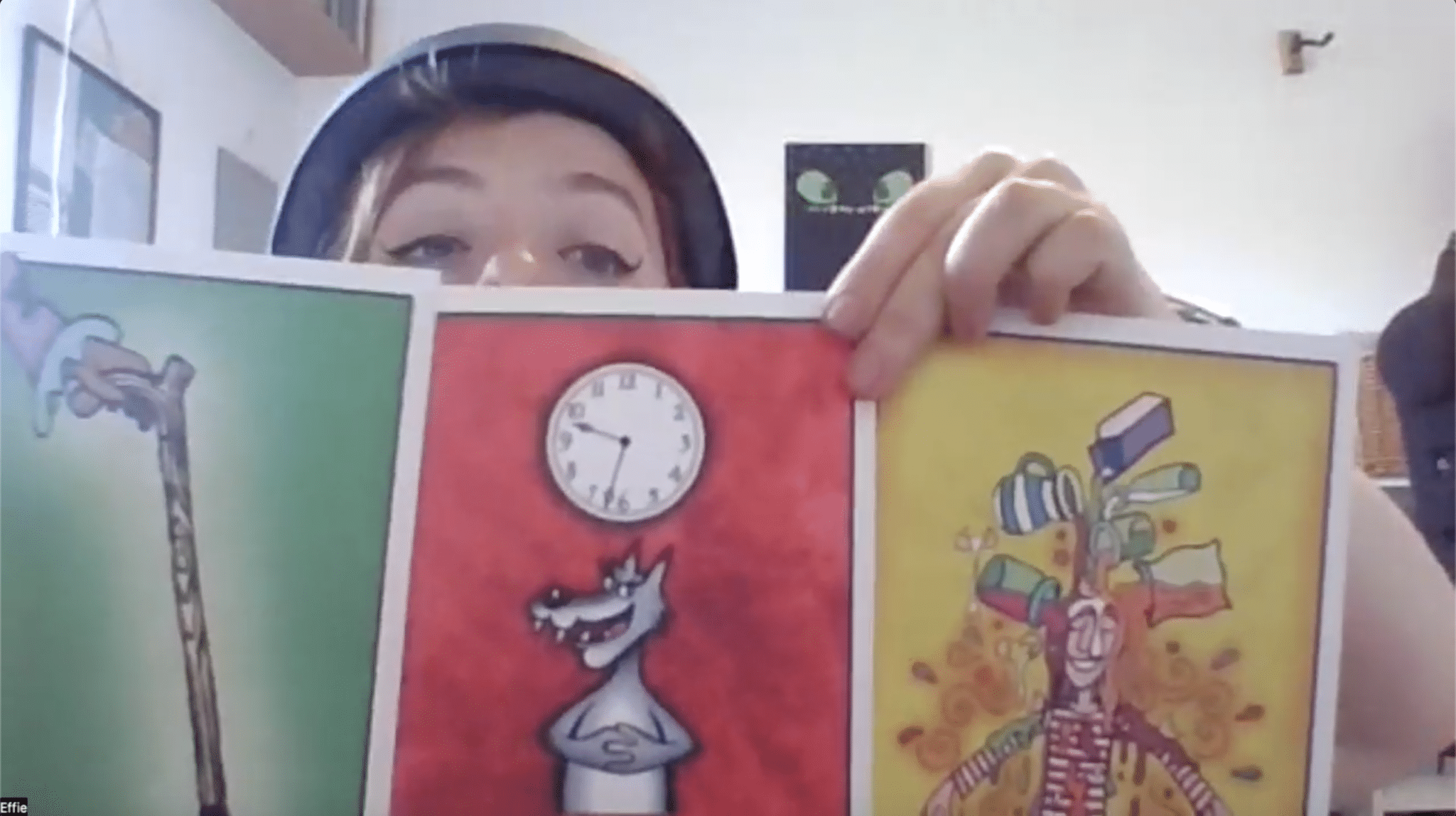 ‘I drawed the wolf shouting dinner time and everyone running away and when he said go to bed and go to school. Someone is crying because she missed the bus! They are holding sponges and things to clean the house.’