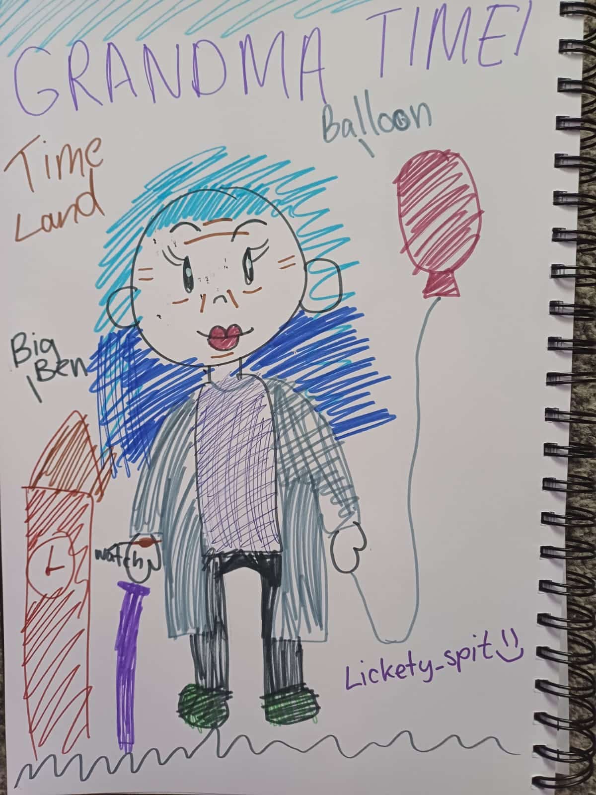 “This is Grandma Time in Time Land holding balloons where we saw the Loch Ness Monster and Big Ben in Time Land. Granny came with us and saw the Loch Ness Monster. She likes to go to the future where we see lots of cyborgs!”