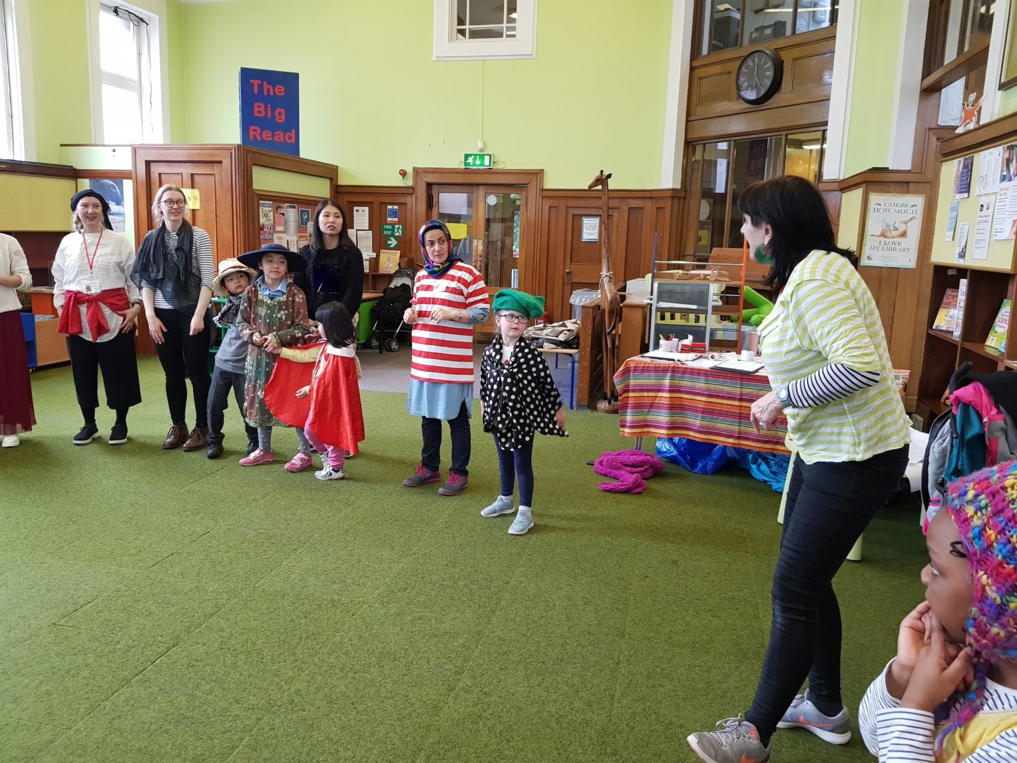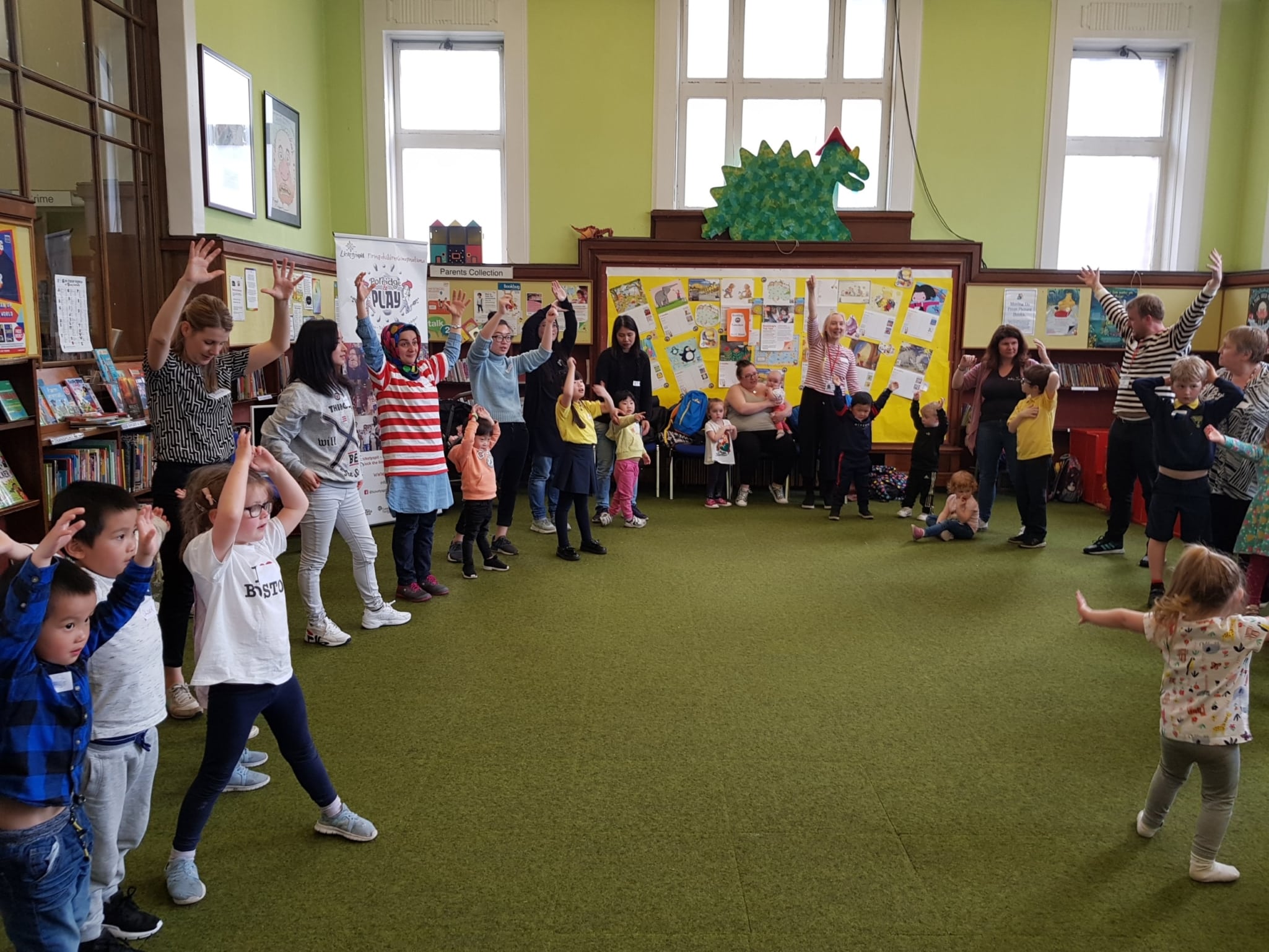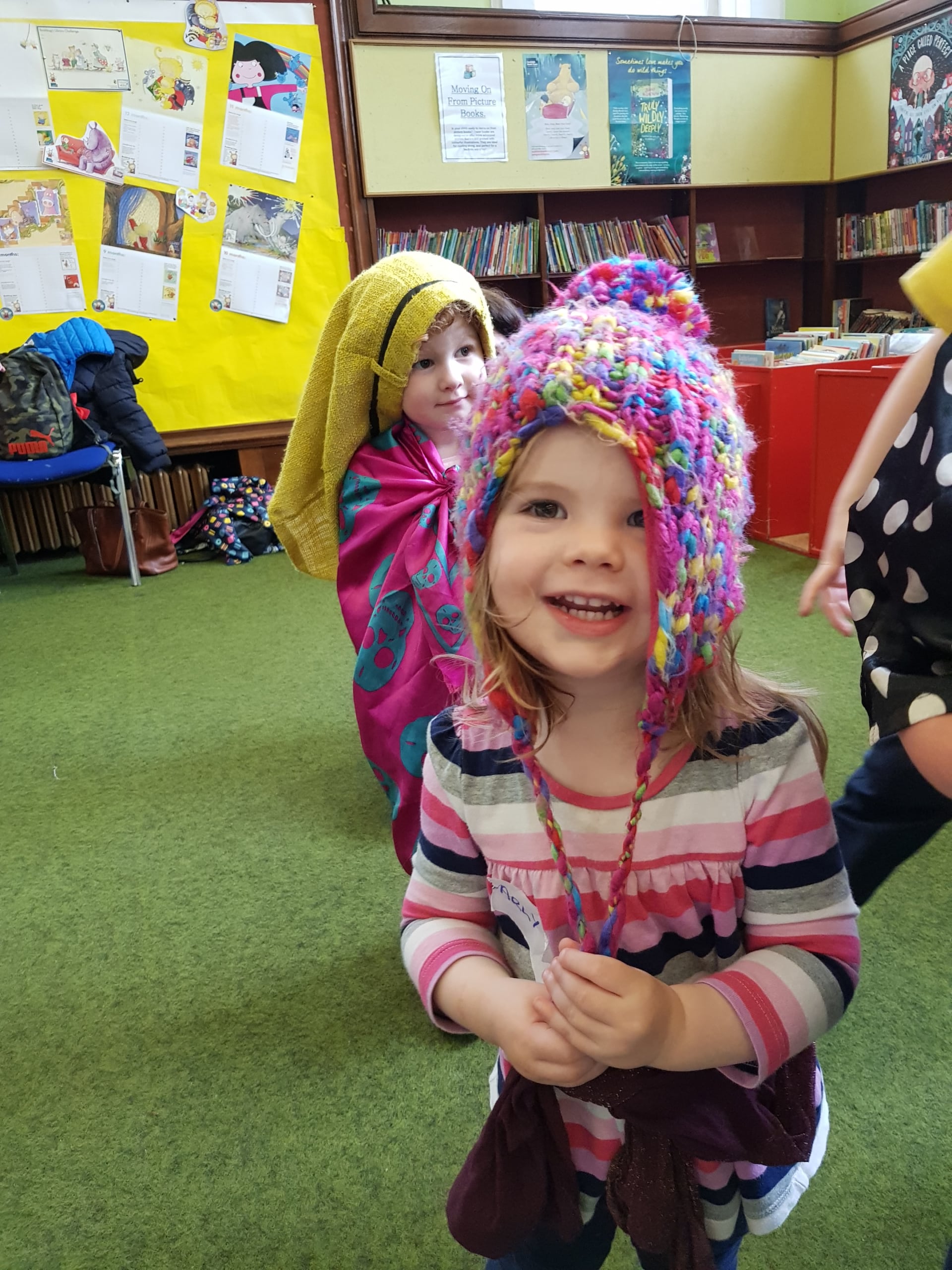 We had a vivacious and energetic play session in the Children’s Library at Whiteinch – meeting the Funky Chicken and his friends, flying off in our Balloons and seeing dragons, dinosaurs and a volcano, and turning into marvellous creeping trees in Monsters’ Footsteps!