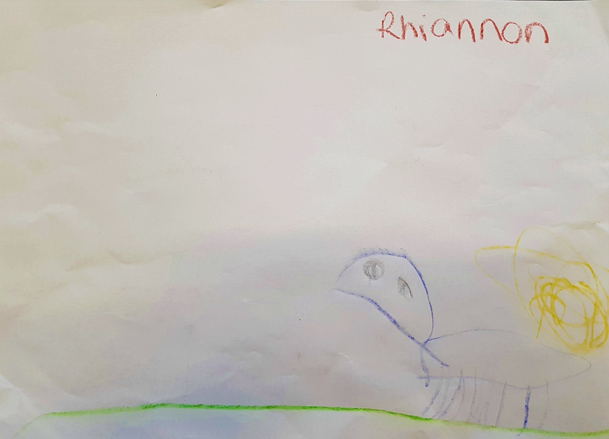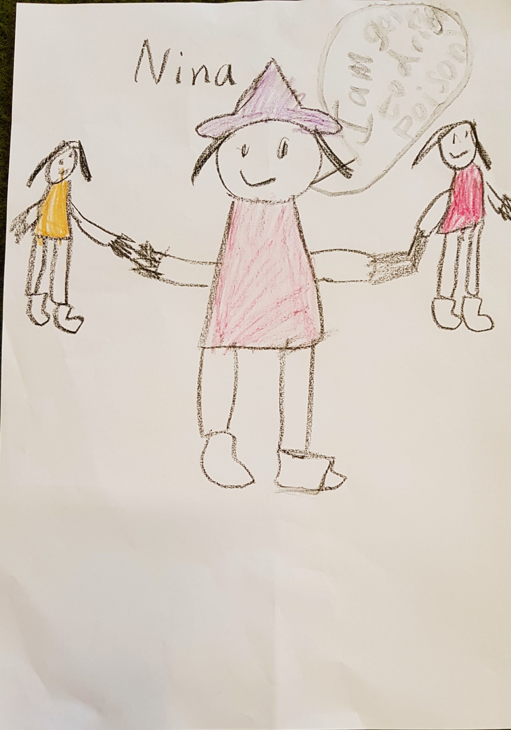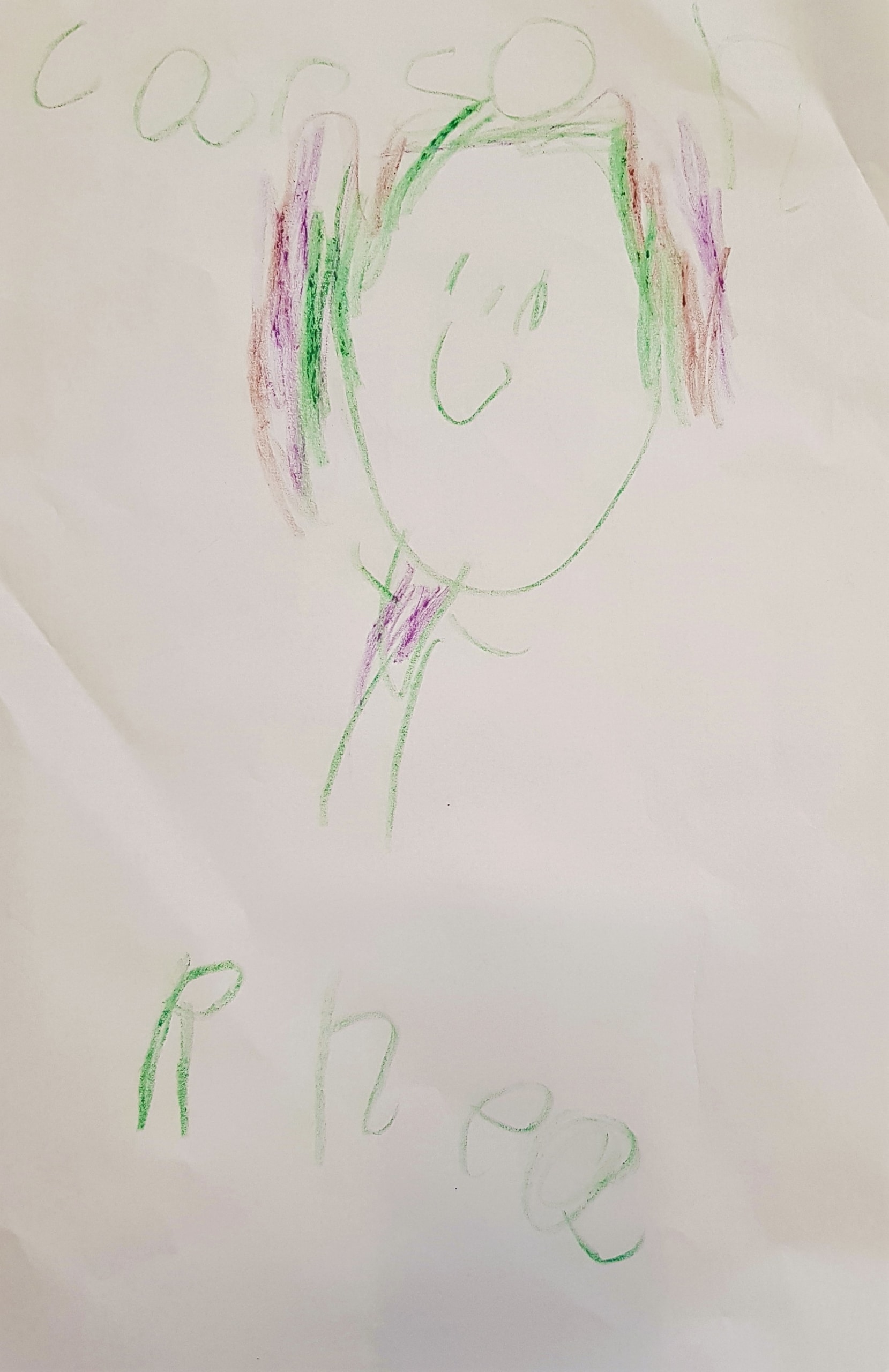“A picture of R, purple, red and green colours for her hair and witches fingers on the back.” (Child, 4)