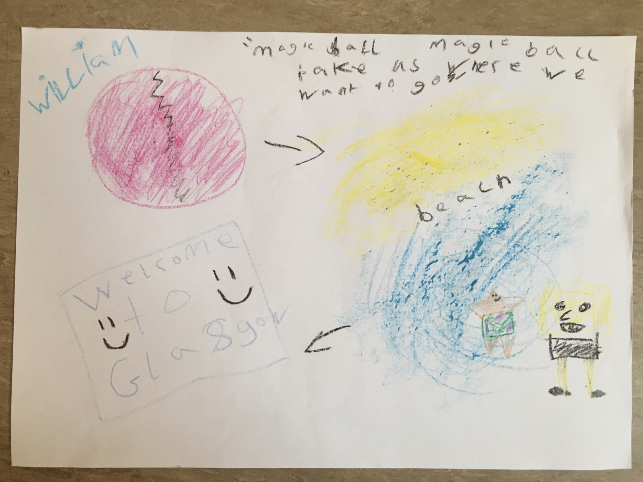 ‘We went into the magic ball then we travelled to the beach then we travelled back to Glasgow. And Patrick and SpongeBob.’