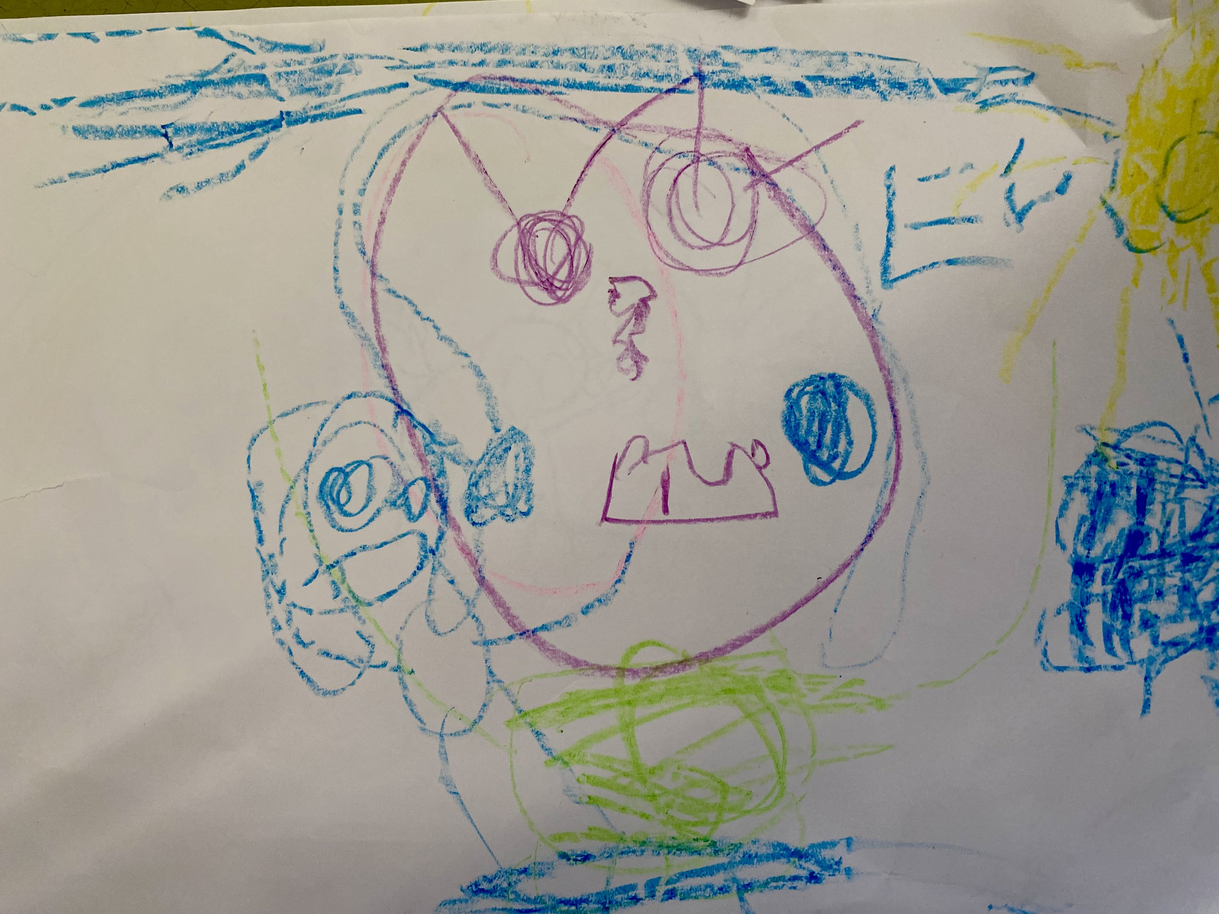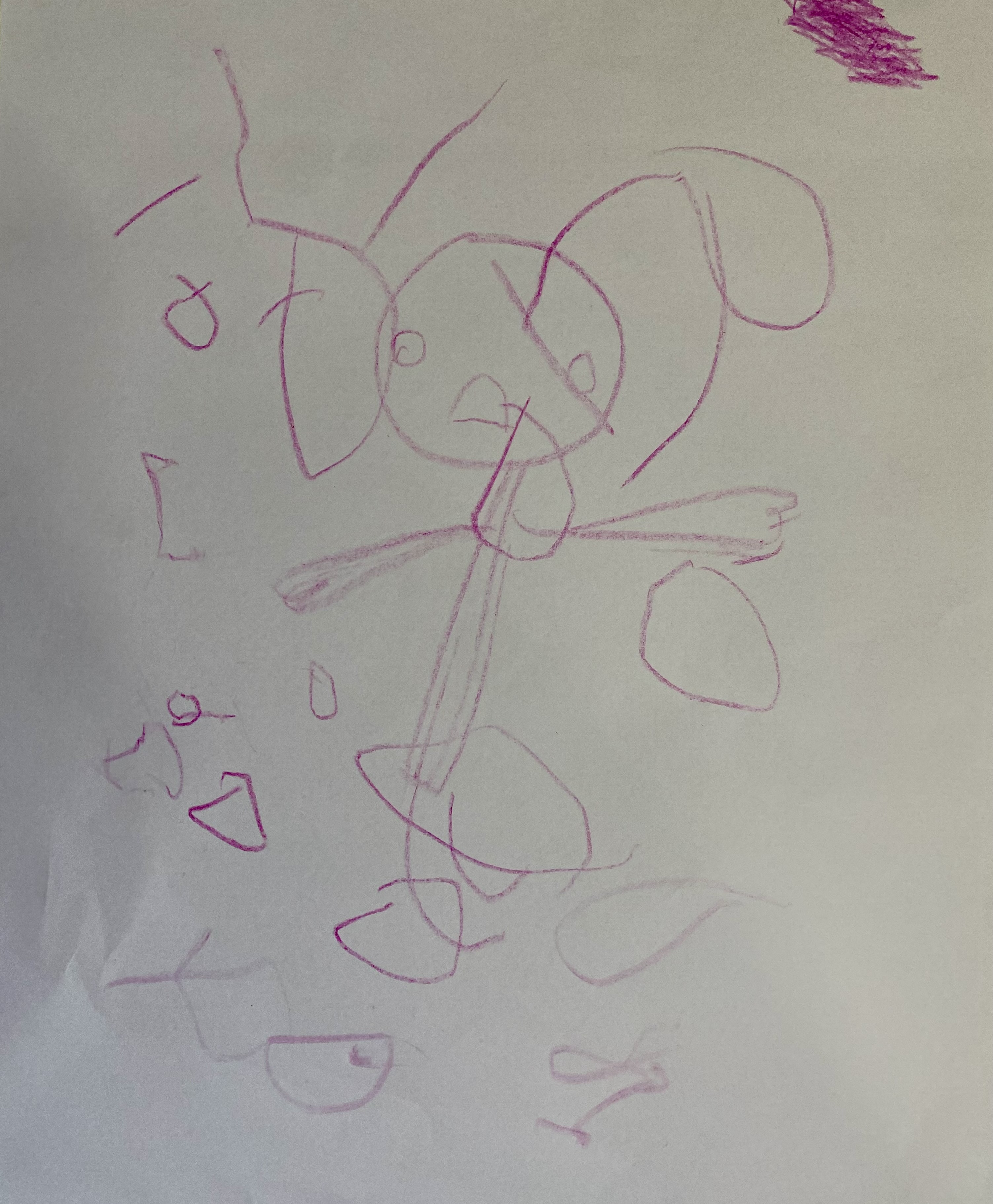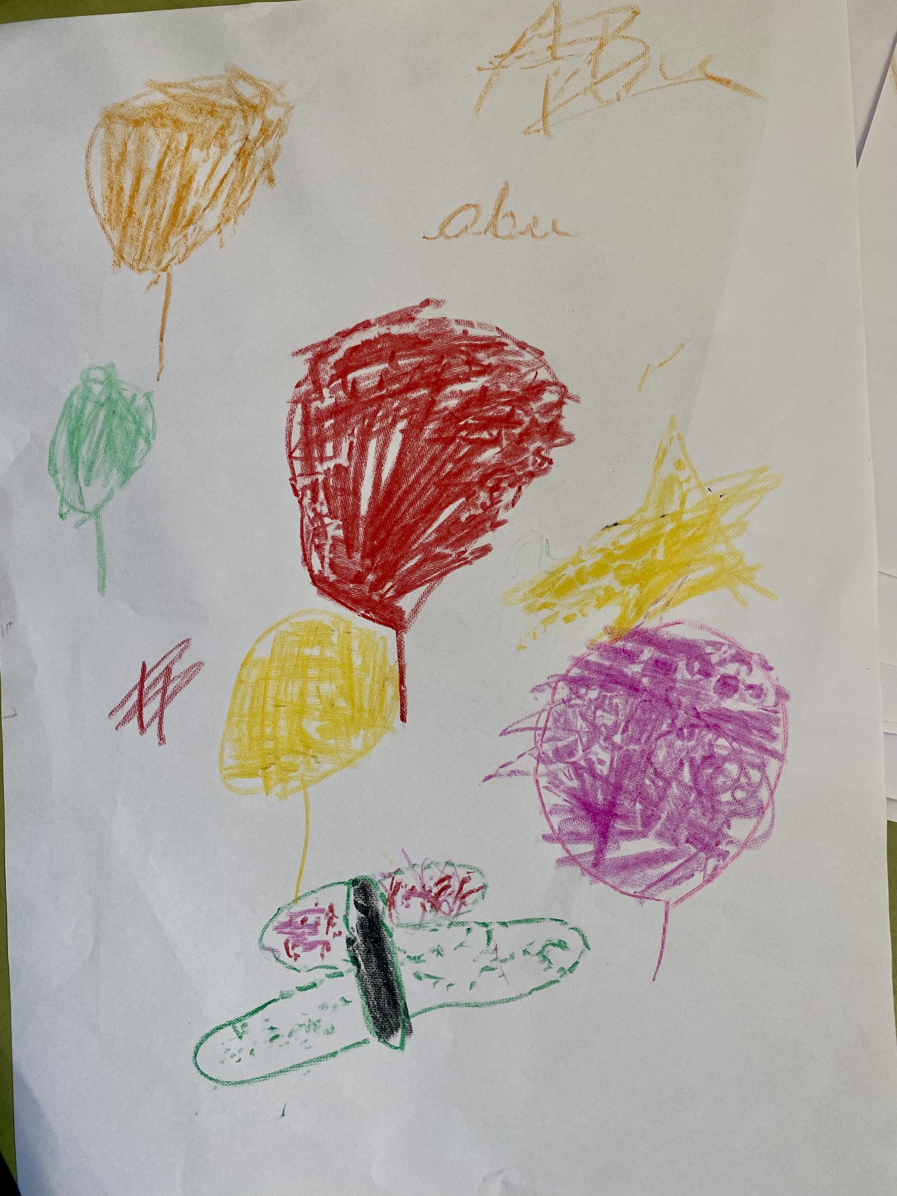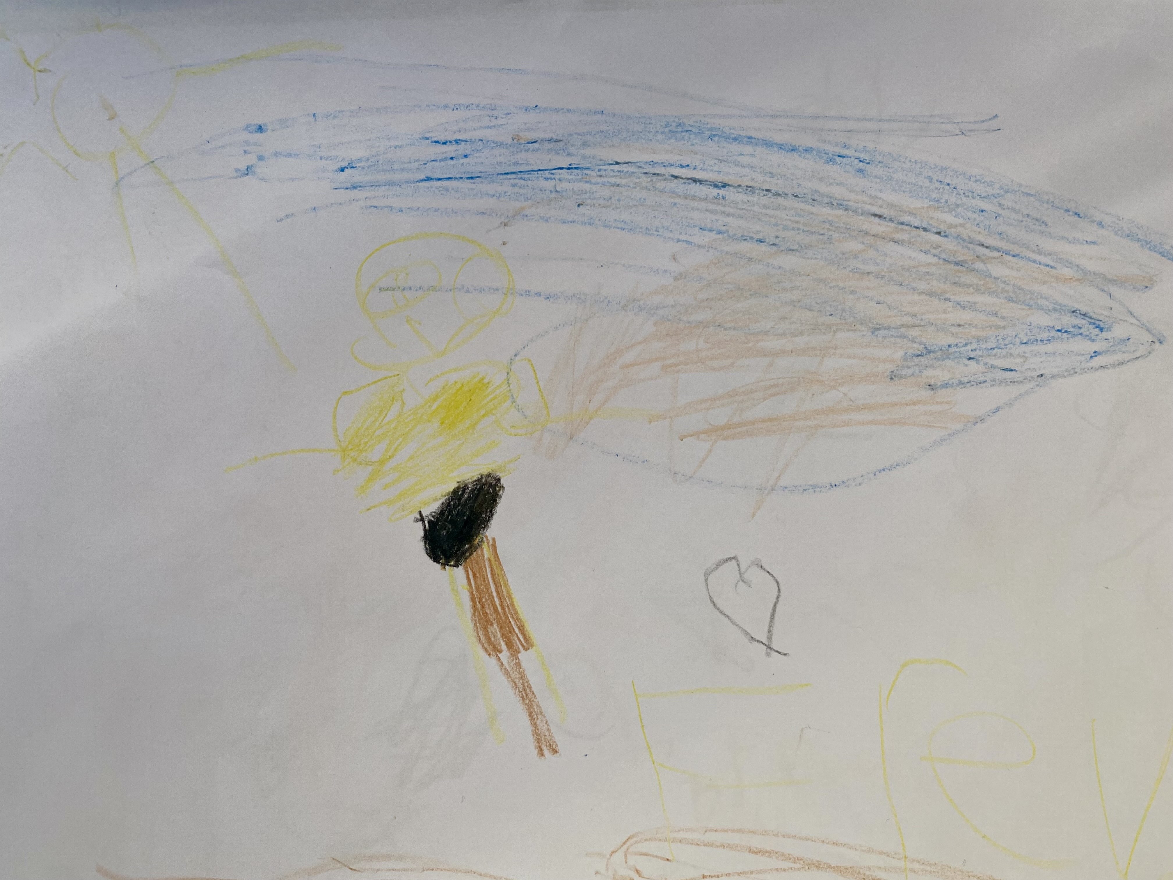 That’s when we sneaked away and that’s a fly and a dog and a fish and that’s the sun setting. And there’s even swings – invisible ones. There was a golden apple but it was invisible and then Evie ate it and she started to dance like that and I copied Evie!