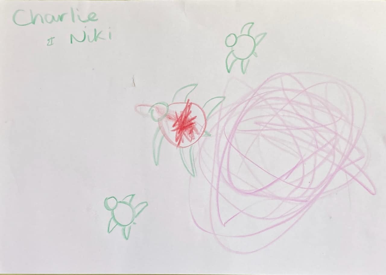 That’s 3 turtles and that’s a pirana. The turtles are swimming. Mum drawed the tails. Fave – going out in the forest