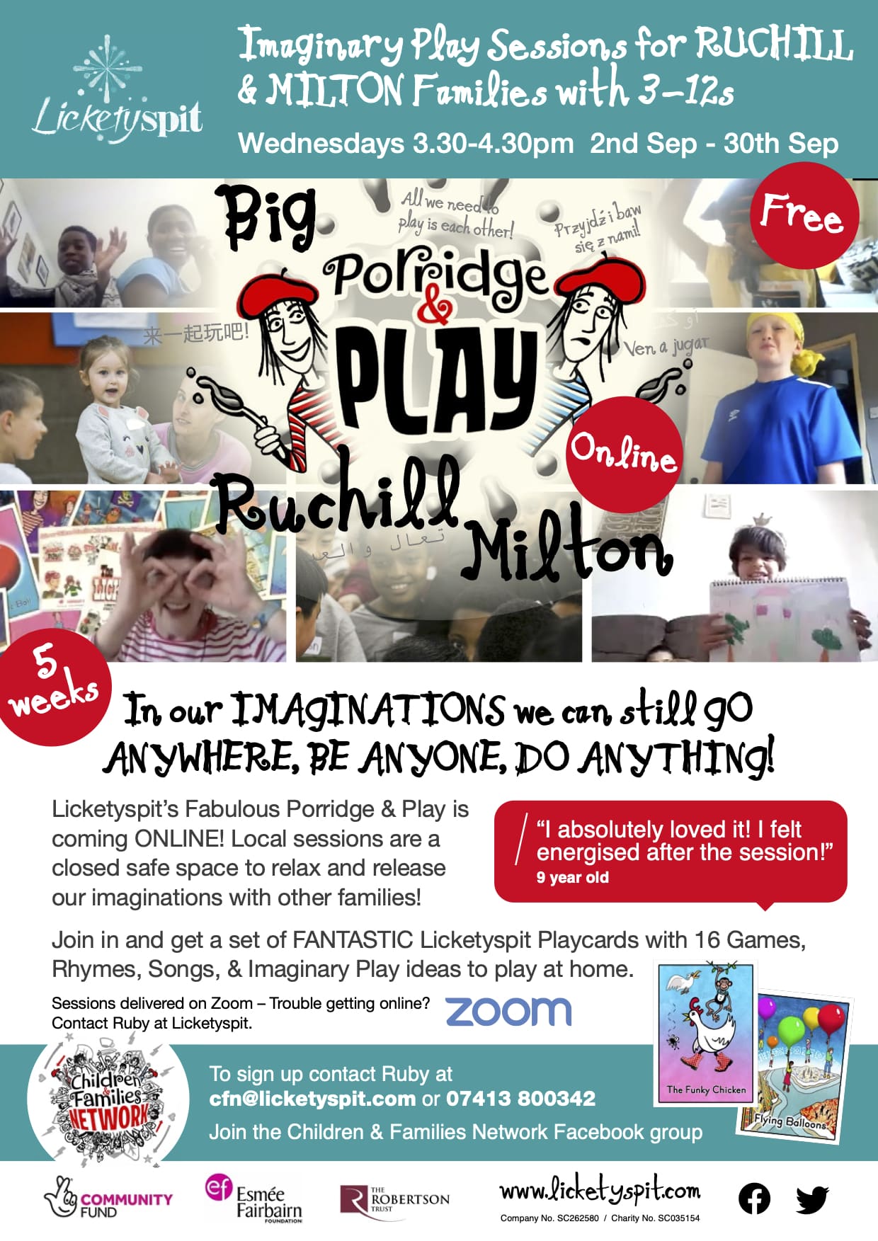 JOIN 17th August 2020 Big Porridge & Play Online community sessions are starting next month for families in Ruchill & Milton! These sessions are delivered via Zoom for families with 3-12 year olds. Participants will receive Lickety Drawing Pads and Crayons and new families will receive sets of Lickety Playcards so you can keep playing the Porridge & Play games at home! BPPG has been running in Ruchill since 2017 and in Milton since May 2020. We may all be at home, but in our imaginations we can go anywhere, be anyone, do anything. All we need to play is each other! Big Porridge & Play has been created with and for children and supports families to tap into their imaginations for hours of joy, excitement, creative learning and connection. Join the dedicated Facebook Group for your community and the Children & Families Network Facebook Group for lots of other activities and  ideas for things to do at home in between sessions like the Cooking, Exploring and Making videos!  To take part in these free sessions, 1) Join the Children & Families Network (CFN) - an inclusive community of families who embrace children’s rights and imaginary play, at www.licketyspit.com/families/network. 2) Email/text Ruby on cfn@licketyspit.com / 07413 800 342 and she will send you the Zoom code! Please get in touch if you would like to access our sessions but have limited online access and we [...]