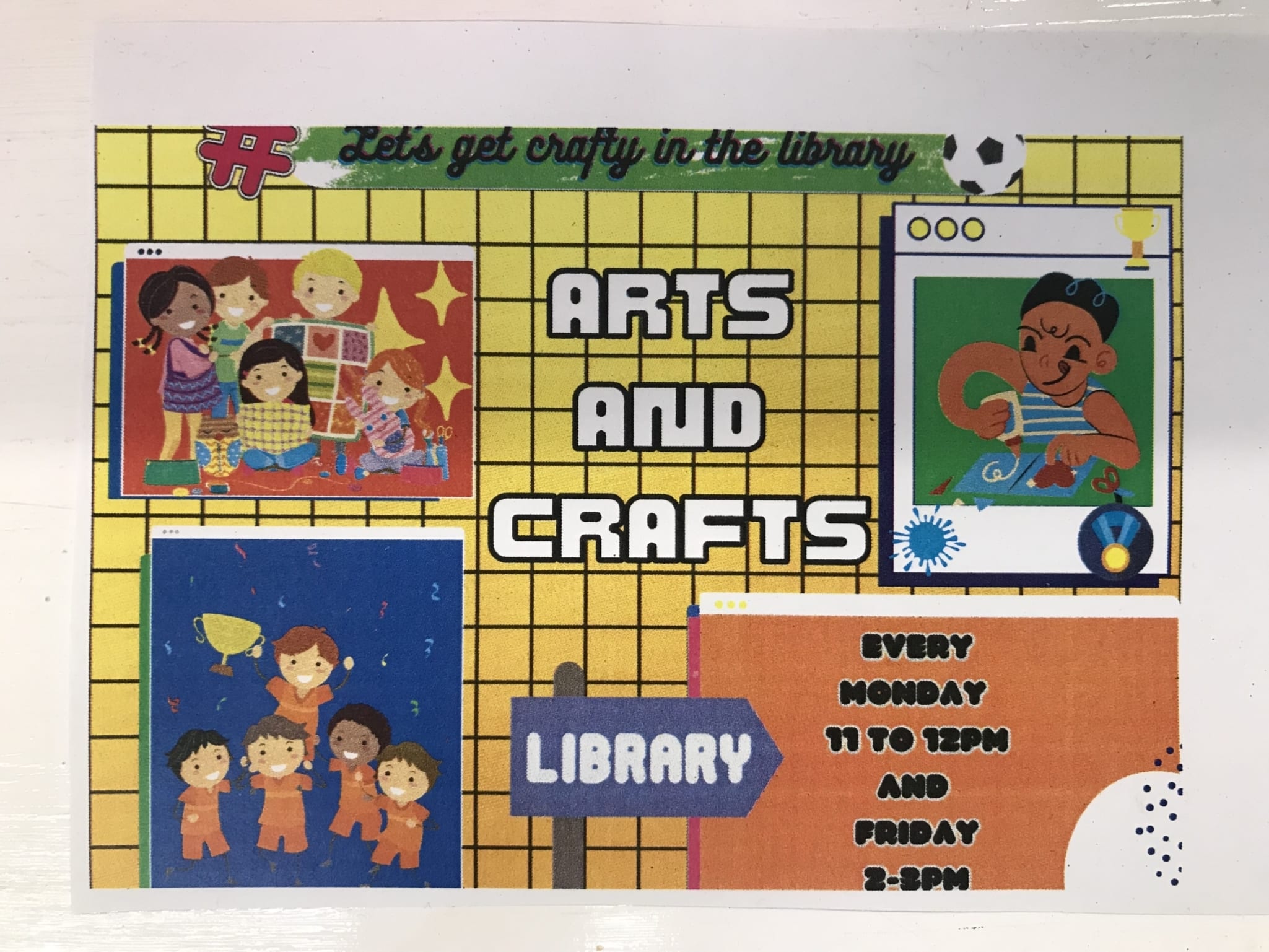 - The Library is hosting Arts & Crafts club on Mondays 11-12 & Fridays 2-3.