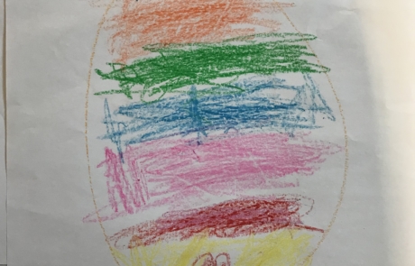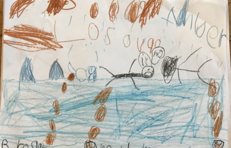 ‘I drawn raindrops and the people running away from the sharks and the cats too. I wrote Brogan and my mum’s name twice. That’s the people eating the raindrops. The cat’s running away from them but he’s gonna fight the shark and the cat.’ Favourite thing – Everything!