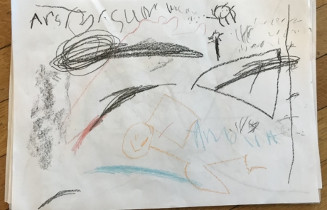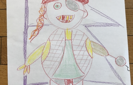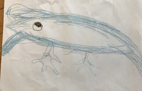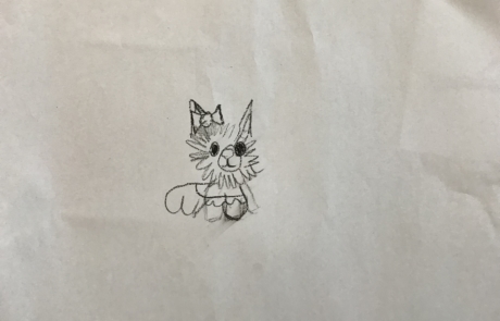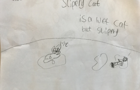‘So this is slippery cat that’s what we were playing and this is a wet cat but slippery and that’s why she’s on the floor because she’s slippery. That’s me when I am cat. My favourite thing was…everything!’