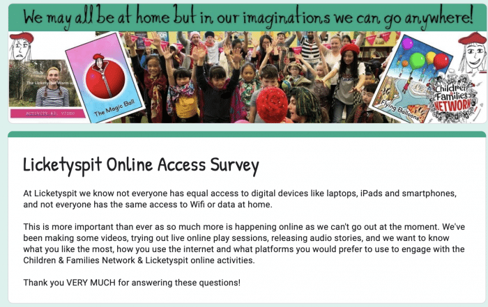 The Licketyspit Children and Families Network is a big community of families across Glasgow and Scotland with children under-twelve, who all know Licketyspit. It’s a place to share experiences, ideas and resources – on social media, by text and by email. We are also working with museums and libraries to create more free drama-led play opportunities.