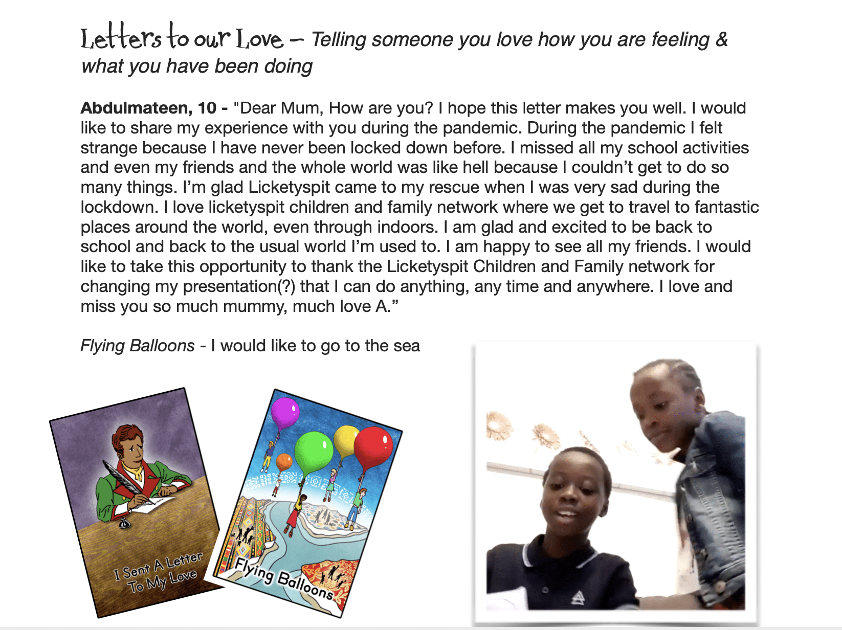 We always encourage you to share drawings, poems, stories, videos and photos of your artistic creations. You can see some of the creativity inspired by our Activity Films, Zoom adventures endplay sessions in the blogs below and the Licketyspit Art Gallery…from Emmanuel’s Acrostic Poem to Exploring with Zainab, to Cooking with Piyanshu, Taiwo and Ope!