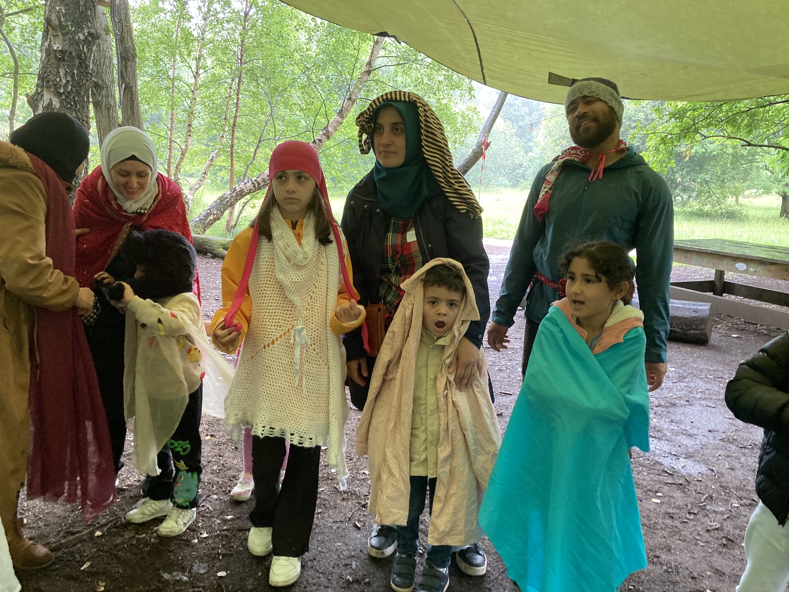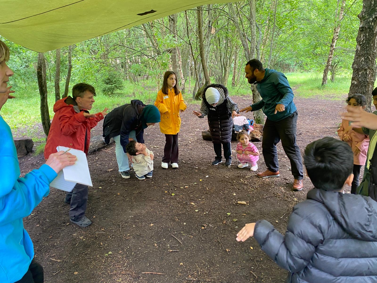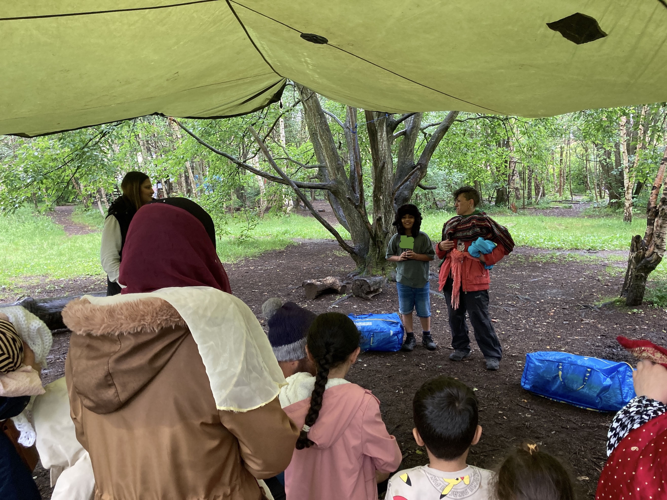 The rain came after all these hot days we’ve had in Glasgow and it is a good thing really because the trees and plants get very thirsty in the hot sun. Forest Storyplay at The Children’s Wood truly is a Storyplay session for all weathers and our brilliant Whiteinch Hub families had put on their waterproofs and their imaginations ready for their turn!