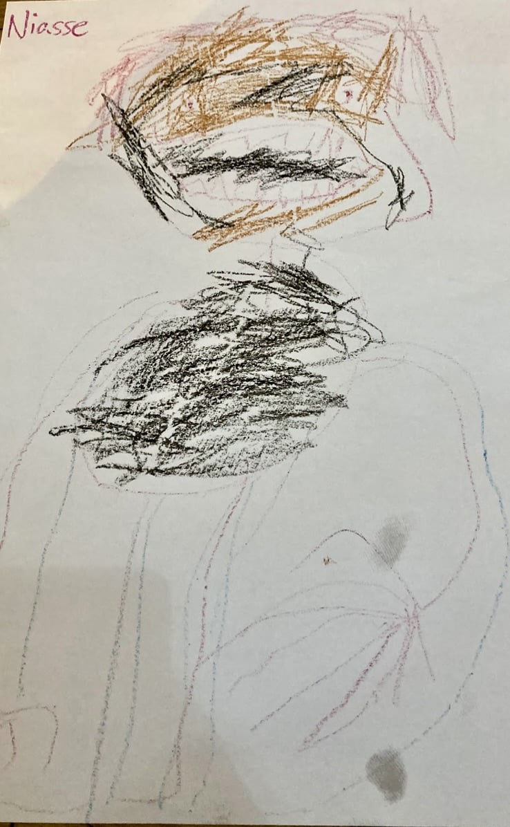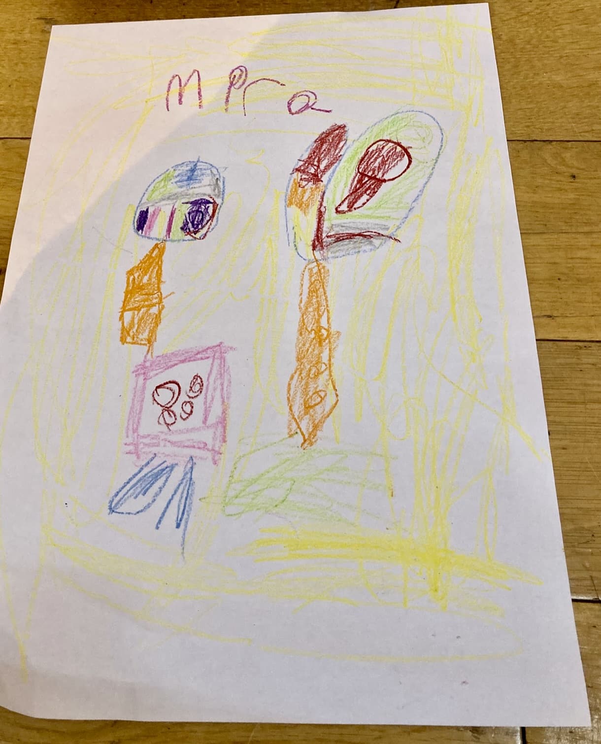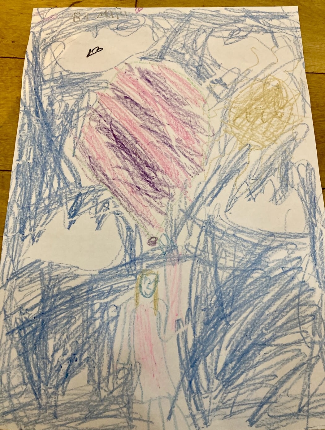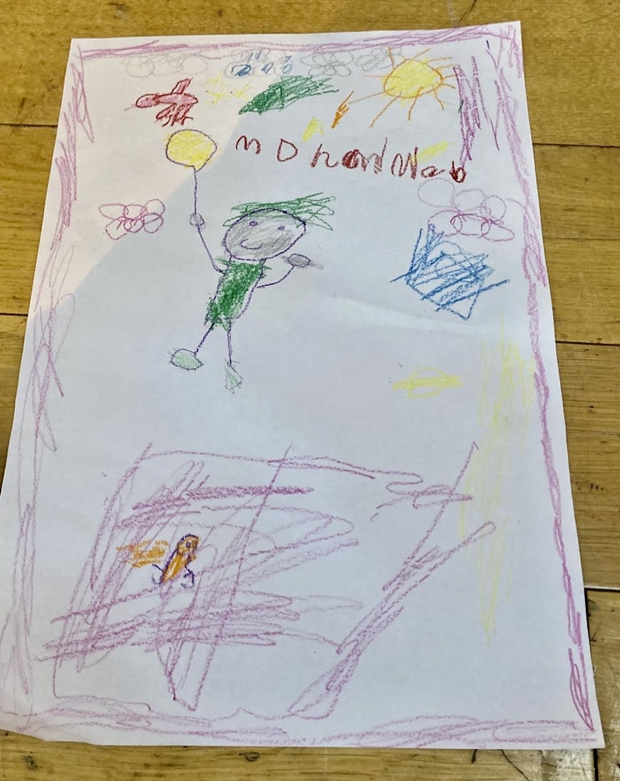 I drew me flying with the balloon. I saw a crab dragon -orange and purple! And a bird. Felt good!
