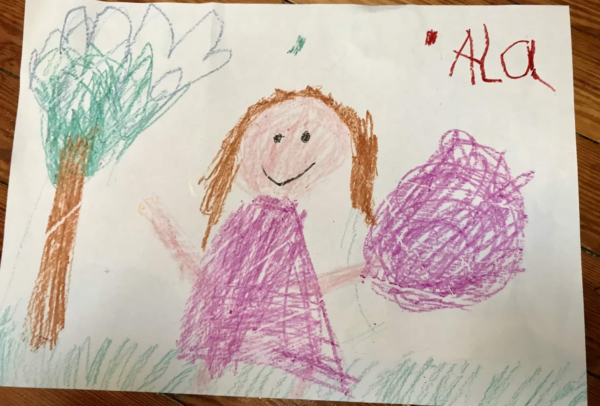 This is me in a balloon. Big balloon bigger than me, a broccoli tree. It’s a big grass, it’s a cloud, tree, broccoli tree covering the cloud. This is me! In a purple balloon. Witches hand (favourite part)