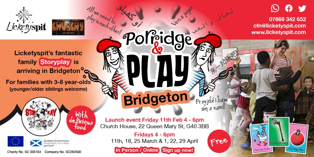 Join us for a Porridge & Play Online Taster! Are you in the Castlemilk area? Do you have a child aged 3-12? Then you can join us for a completely free online taster of Porridge & Play! Join us for a great imaginative Storyplay session! We will play some of our much loved games and you can find out what Porridge & Play is all about! If you are interested then please E-Mail Rhianne at rhianne@licketyspit.com saying you would like to attend the Castlemilk Online session, the name of everyone attending (including the grown ups!) and the ages of your children. ALL the family is welcomed! 🤗