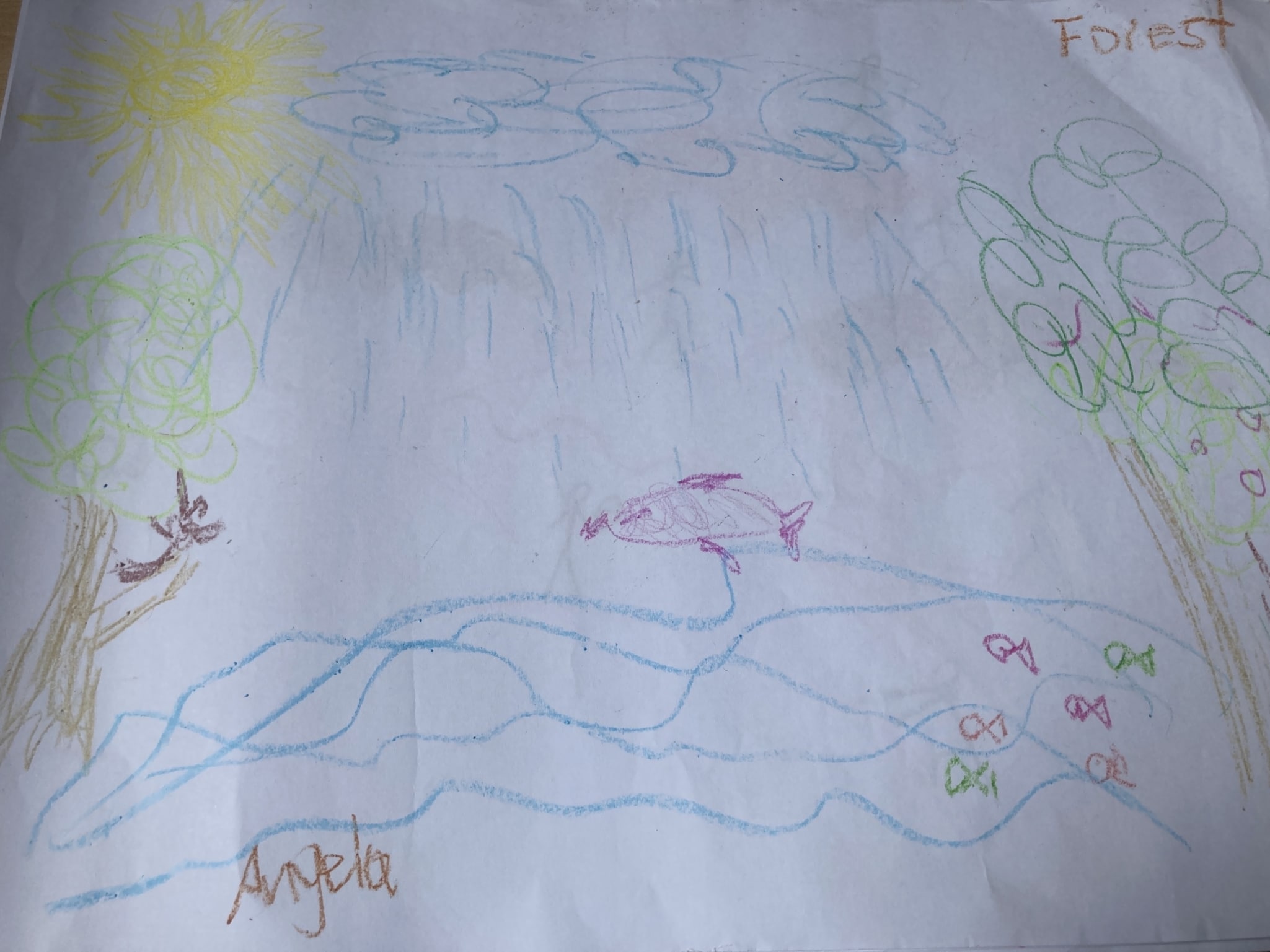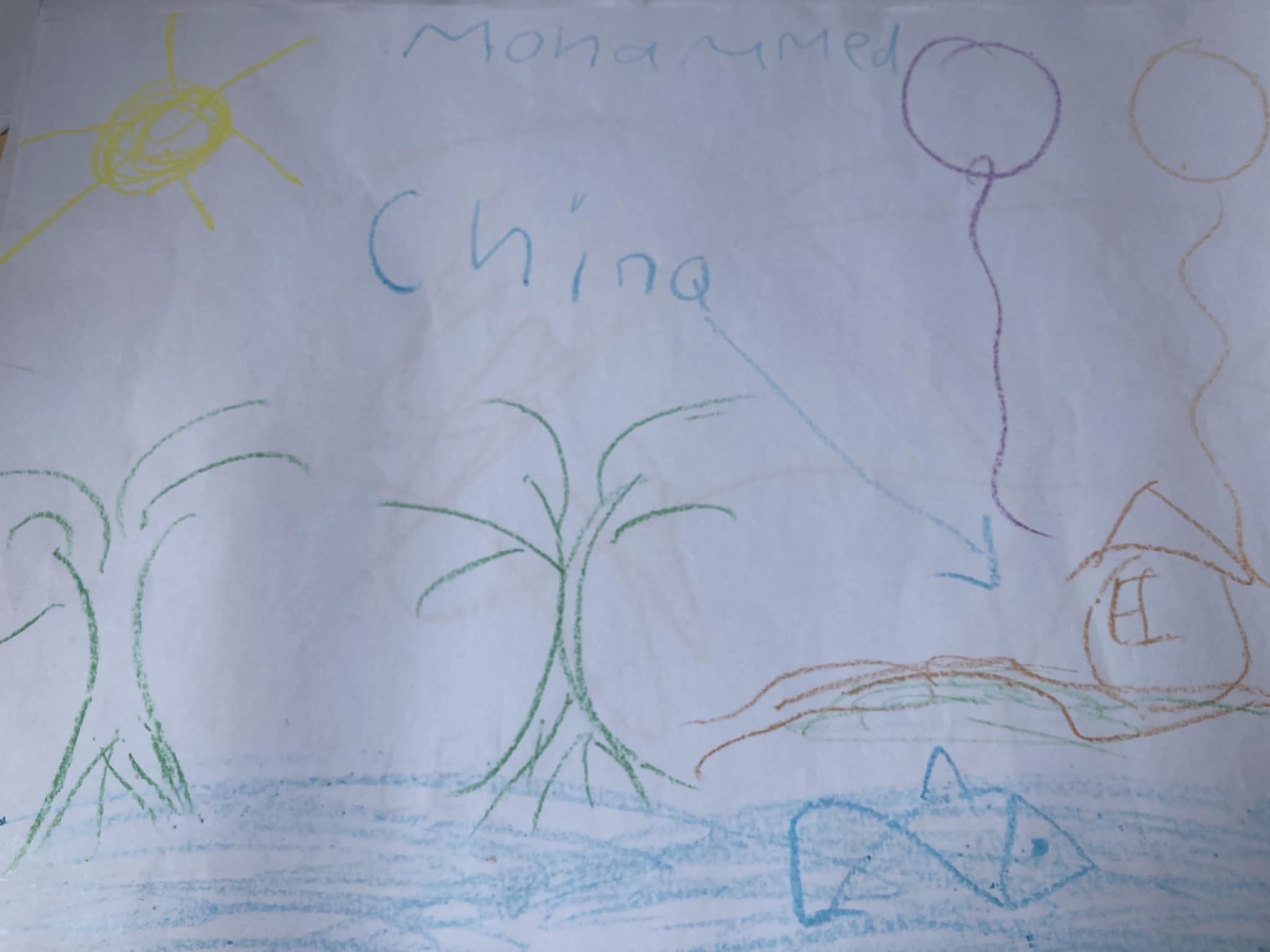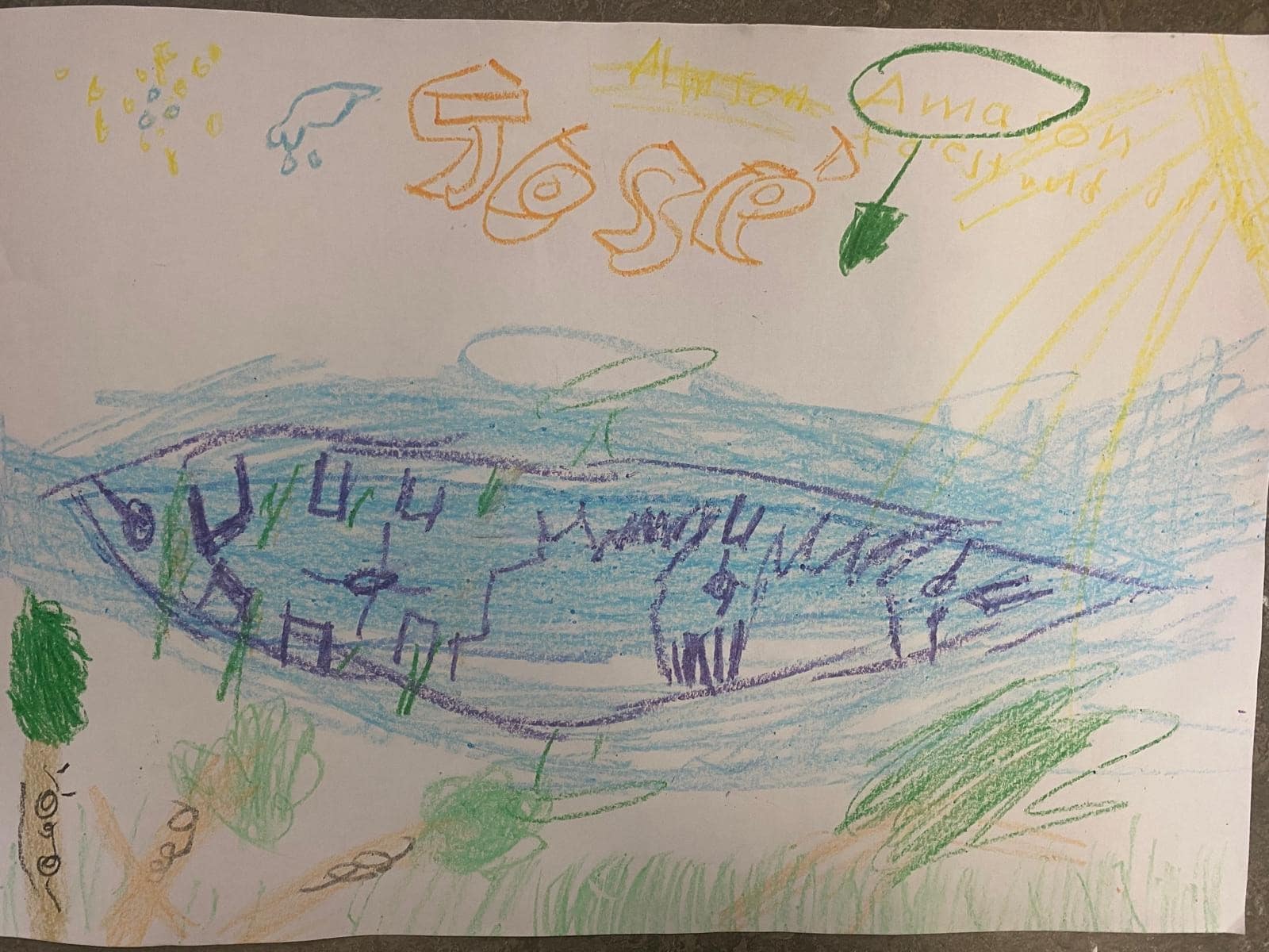 ‘I wanted to draw China but I am very bad at drawing so this is easier for me and so I did a forest. In my country there are pink dolphins in the Amazon’