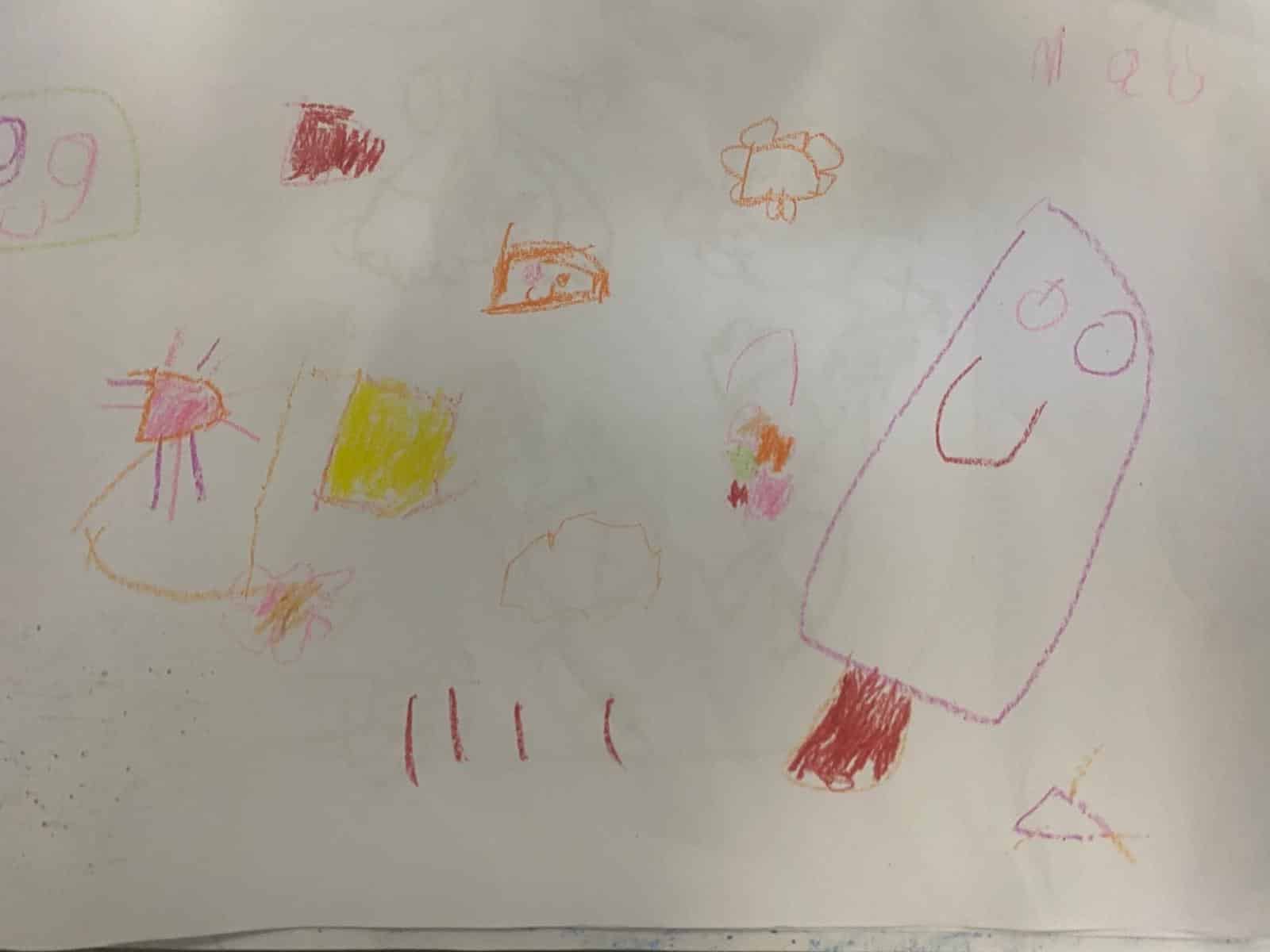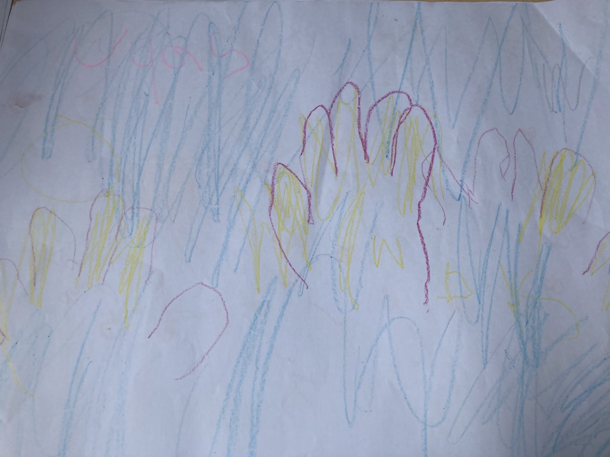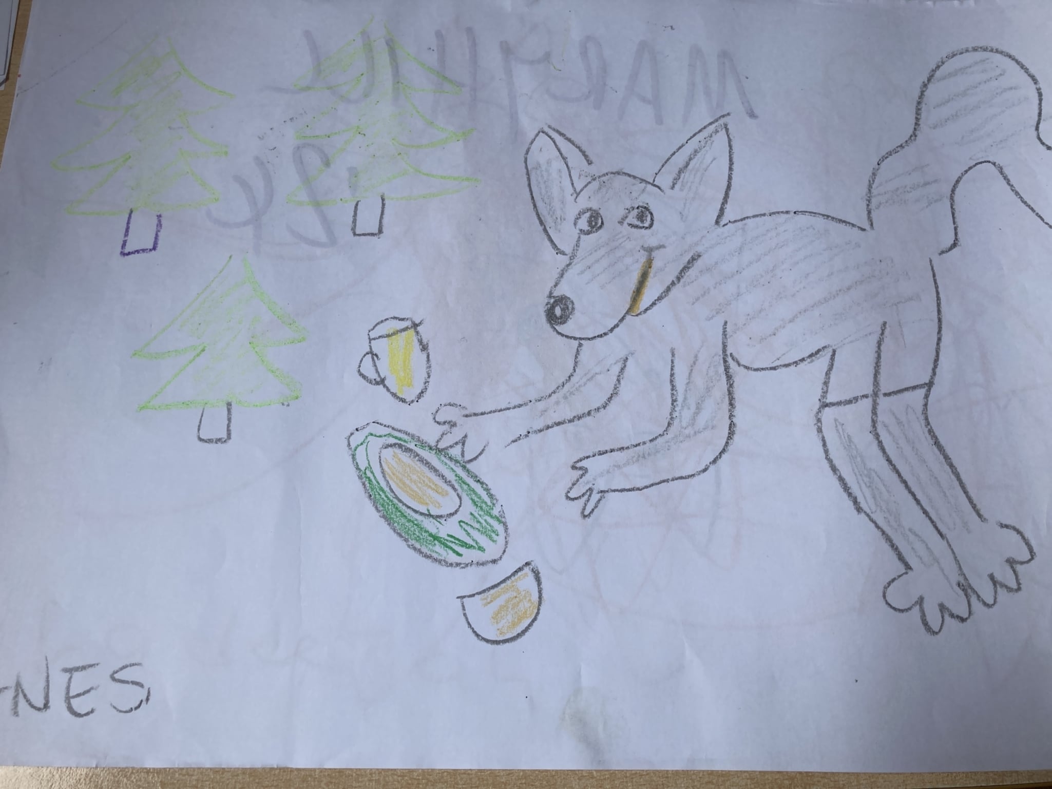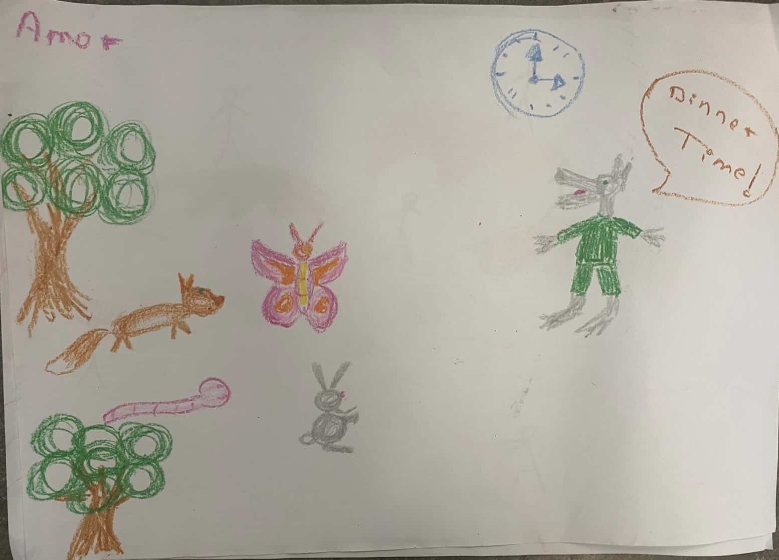 ‘Well, this is mr wolf yelling that it’s dinner time so this is the forest creatures playing with Mr. Wolf. The butterfly, the rocks, the rabbit and I couldn’t remember!’