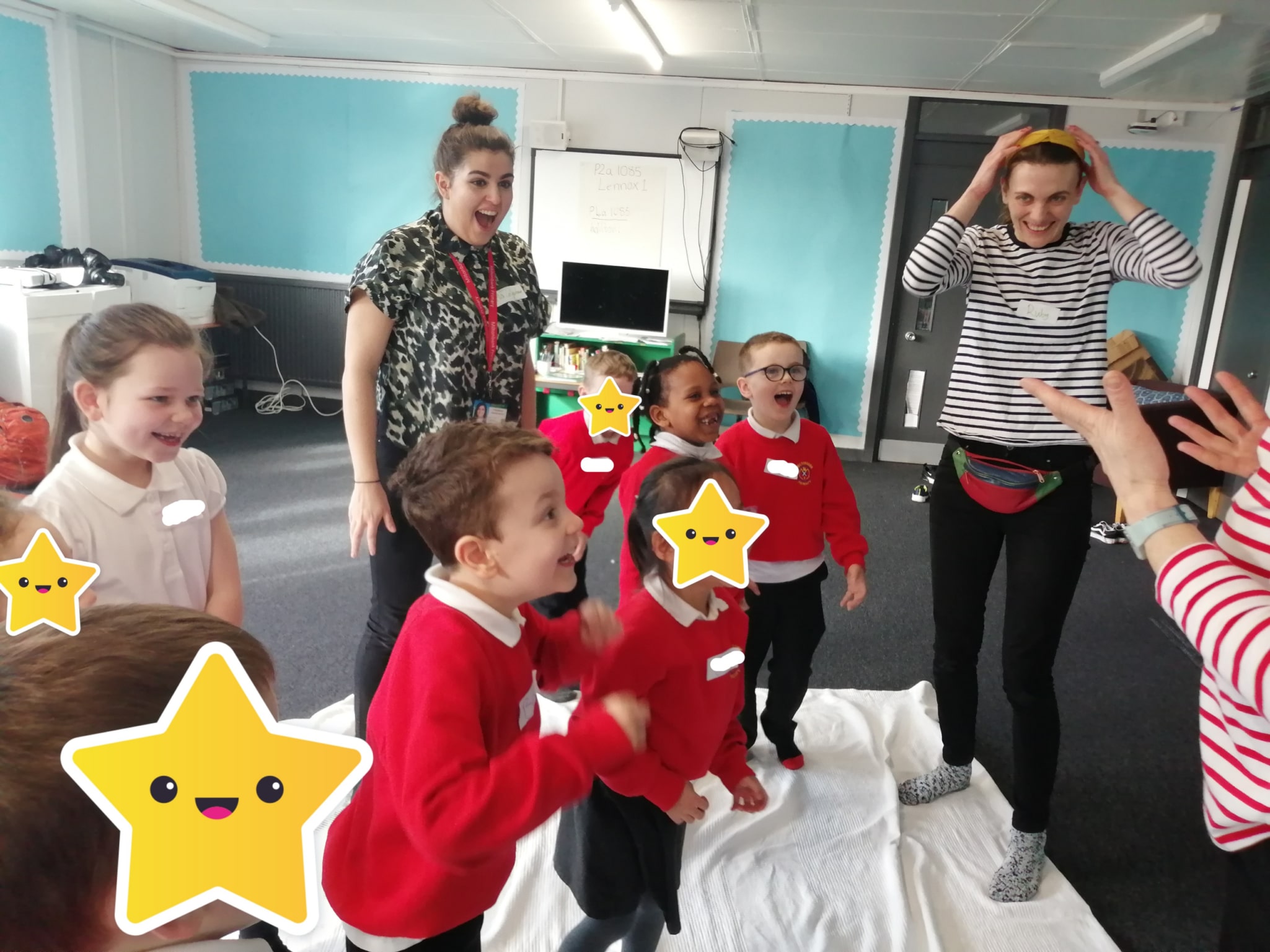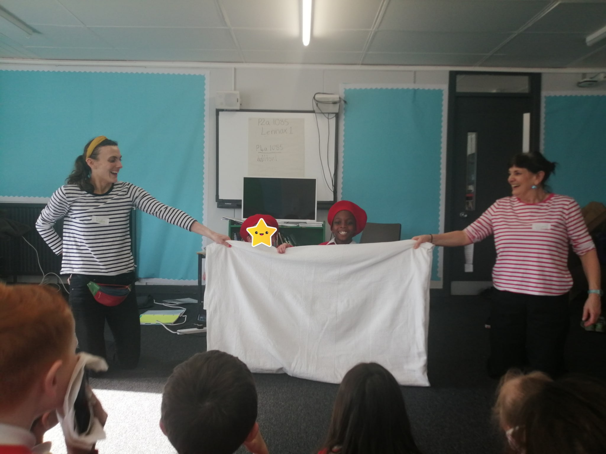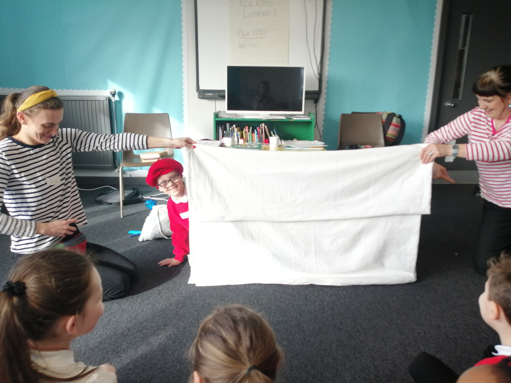 We pretended to be Happy Margaret and Worried Margaret popping out from behind the curtain to the music – it was very funny! Then we made the blanket into the bog, the sea, under the sea, the cave, the bear, the bird and the mountain!