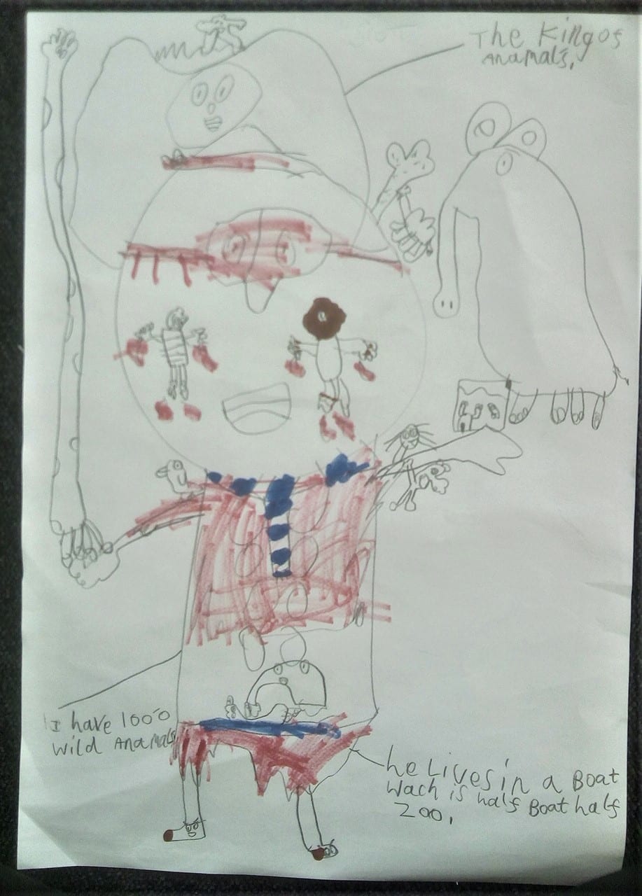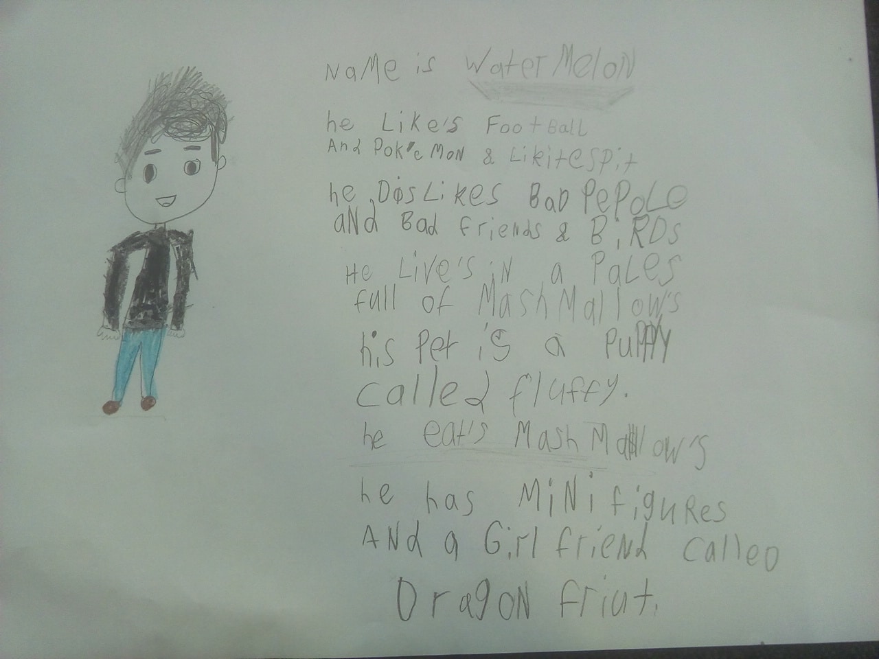 His name is Watermelon- his nickname- his real name is Melon. He likes football and Licketyspit. He doesn’t like bad people. He lives in a palace of marshmallows, his pet is a dragon who eats marshmallows. He’s round about 13 and he lives in a palace I think his family was rich and gave it to him.