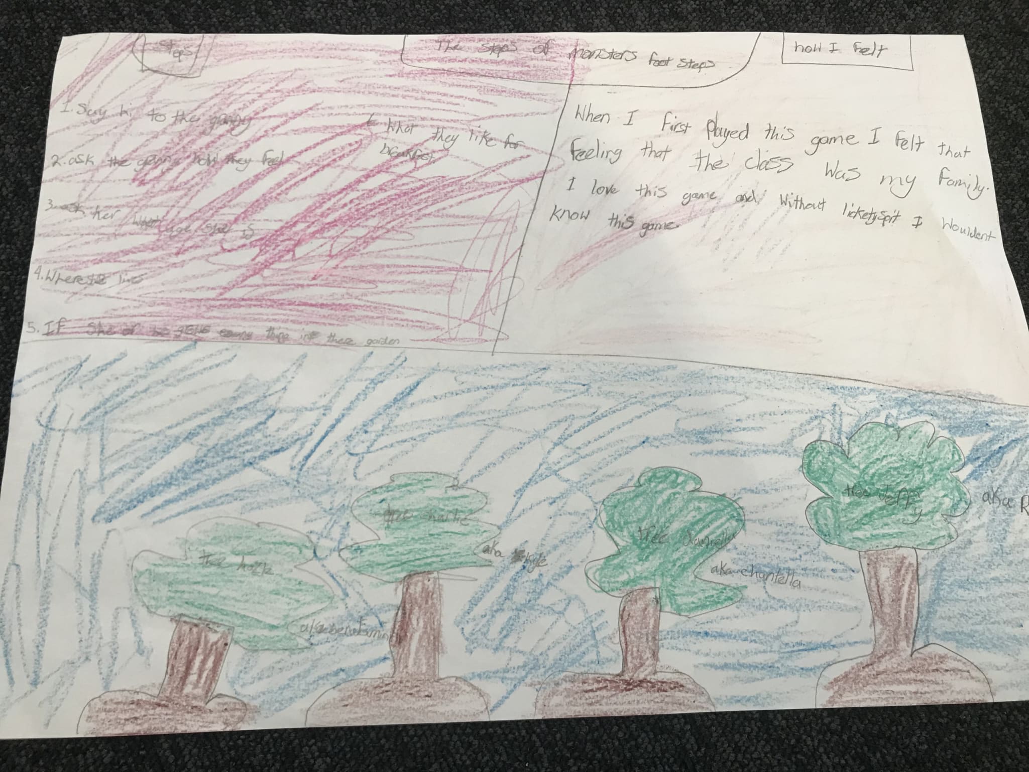 We landed in the North Pole and it was absolutely freezing cold! Luckily Leah had a huge tent for everyone so we all helped to put it up and managed to quickly get warm inside by lighting a fire and putting on extra layers. There was lots of space for everyone to huddle round the fire so we handed out marshmallows and fish and had a BBQ, it was really delicious! We then went on a walk out into the arctic where Rudolph appeared! He was very excited to see us and was extremely excited to drive us on his hovering spaceship car to try and find Santa! Santa (Kyle) gave us all a present, with a couple of bits of coal… and we then travelled on the back of Macy’s huge blackbird, back to the magic ball!