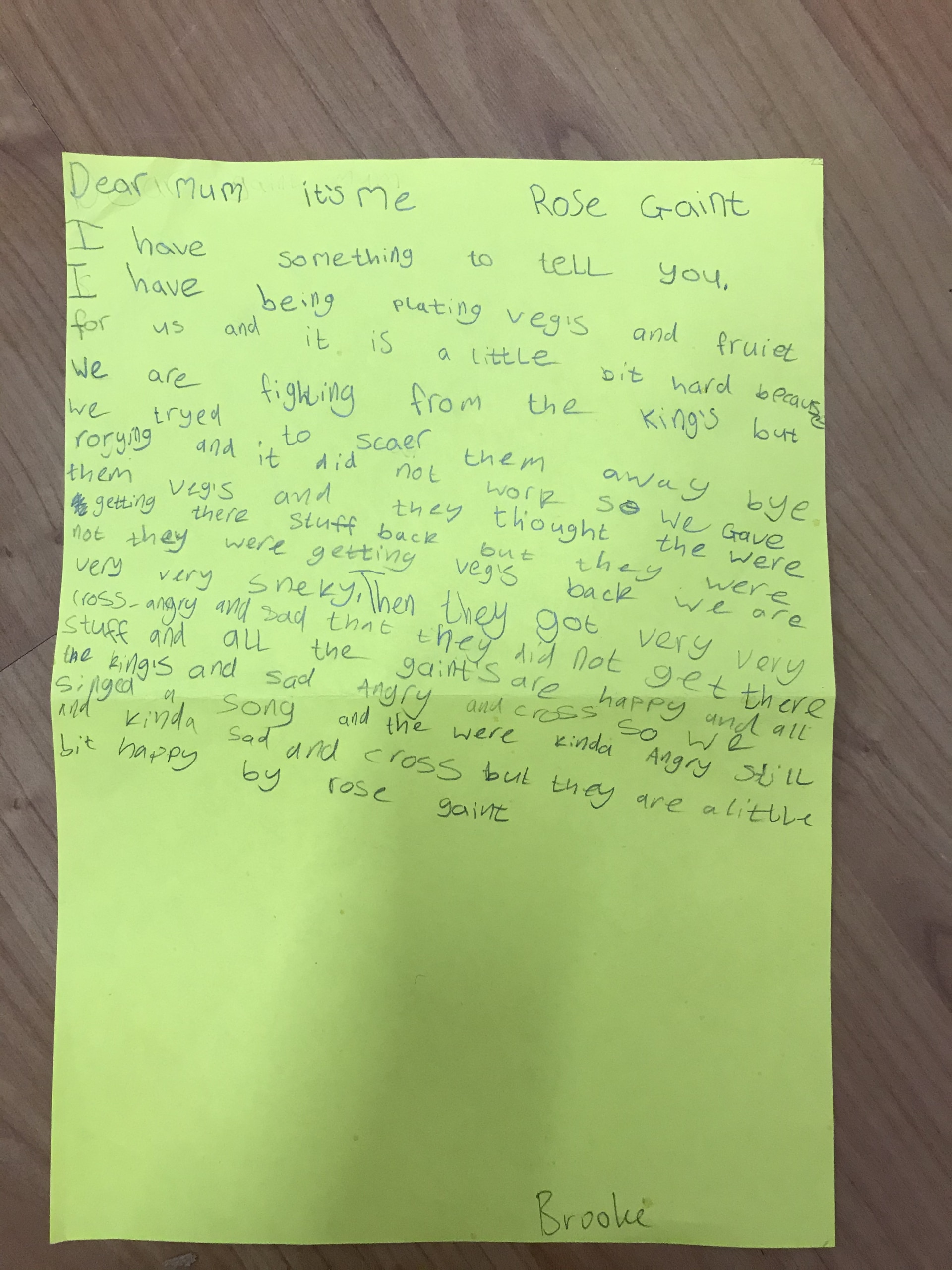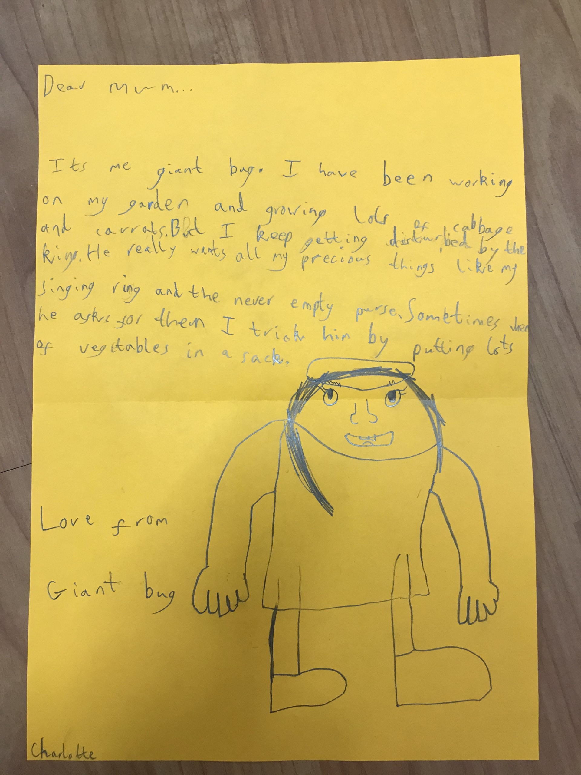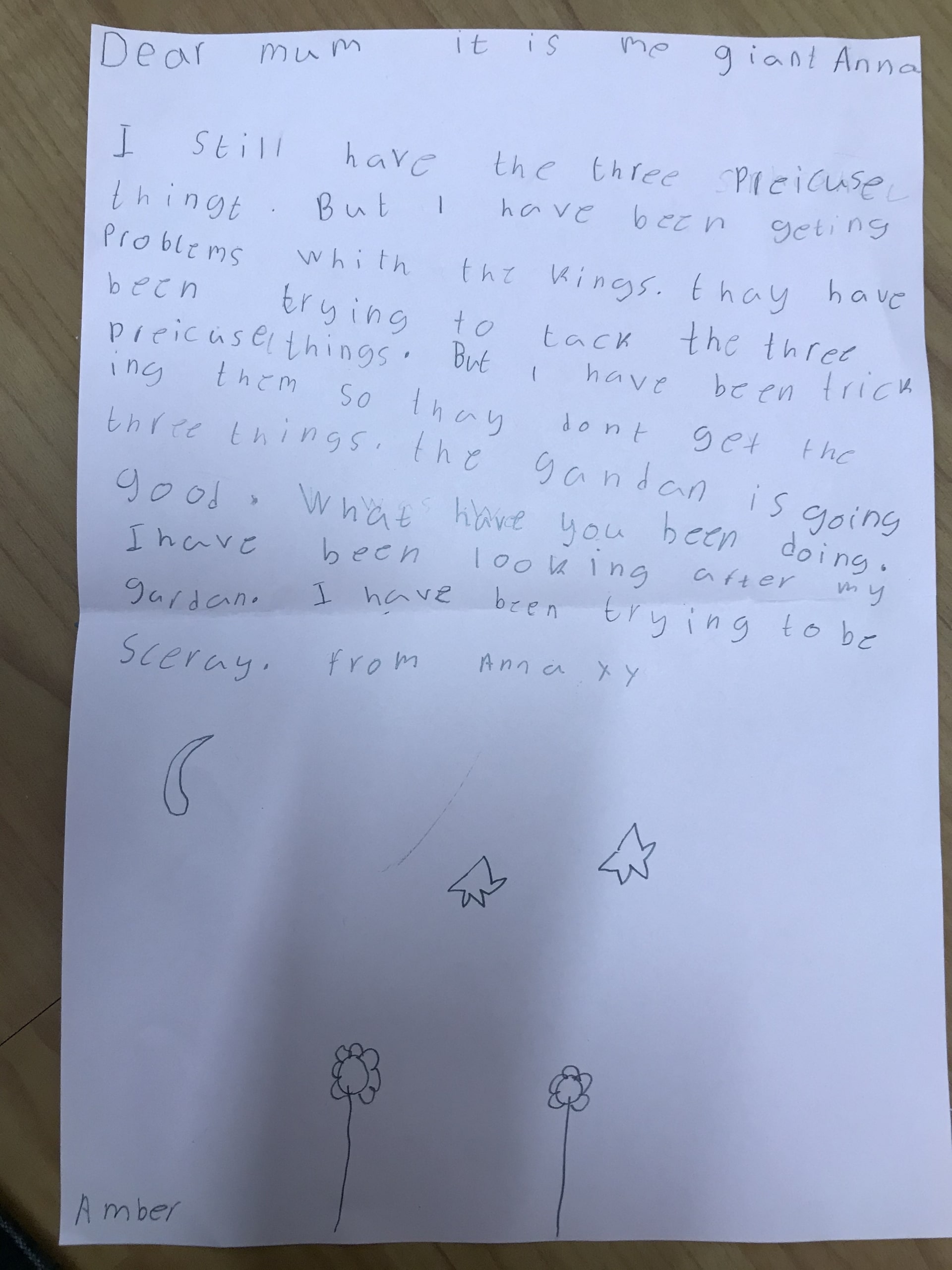 Then the Giants wrote a letter to their Giant Mums to tell them their news and what a problem they are having with the King asking for the 3 precious things…