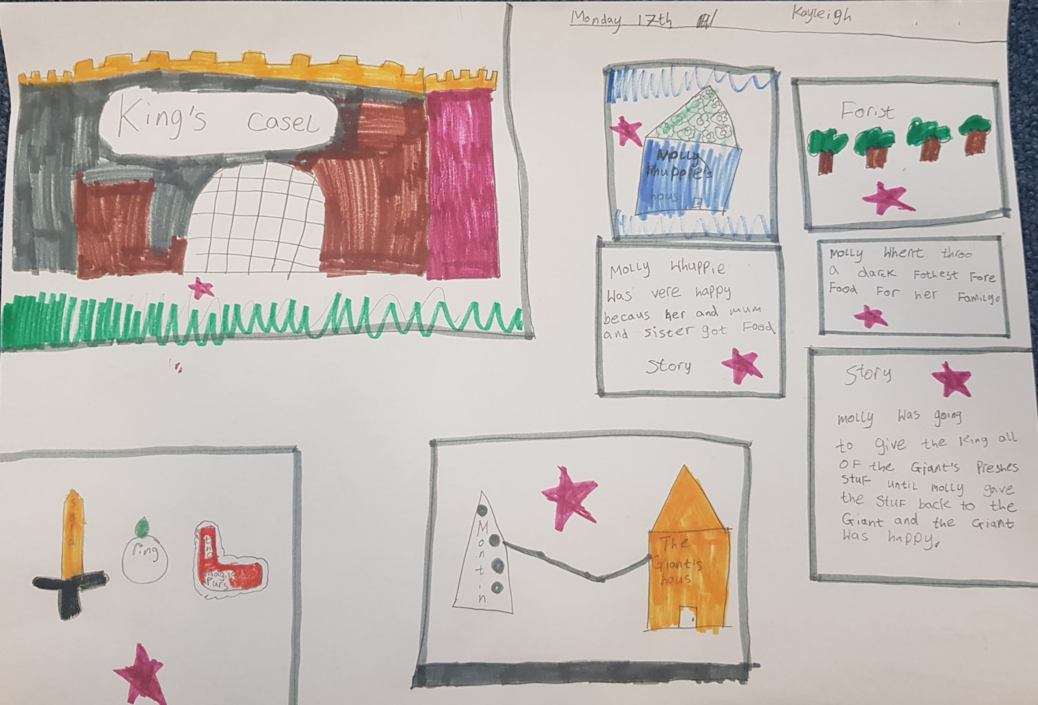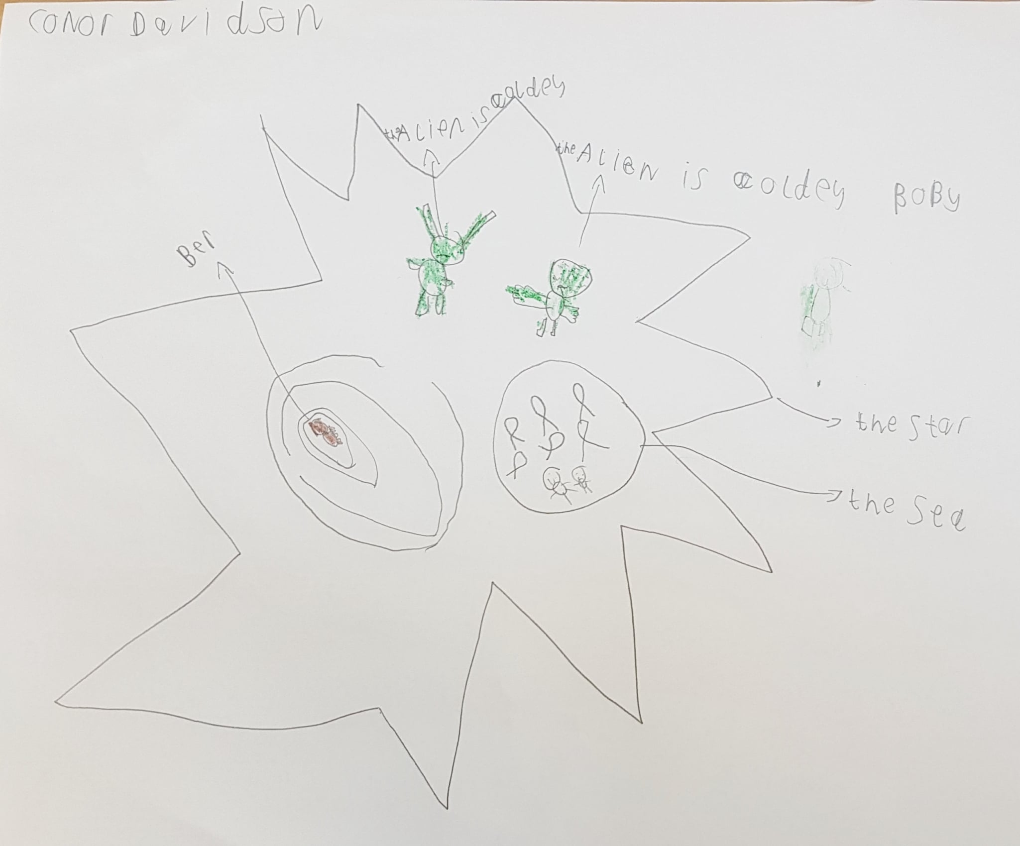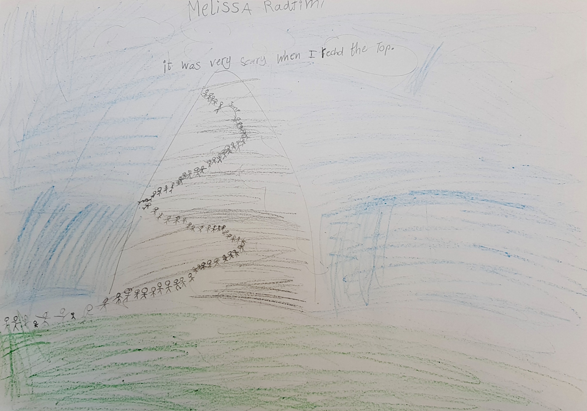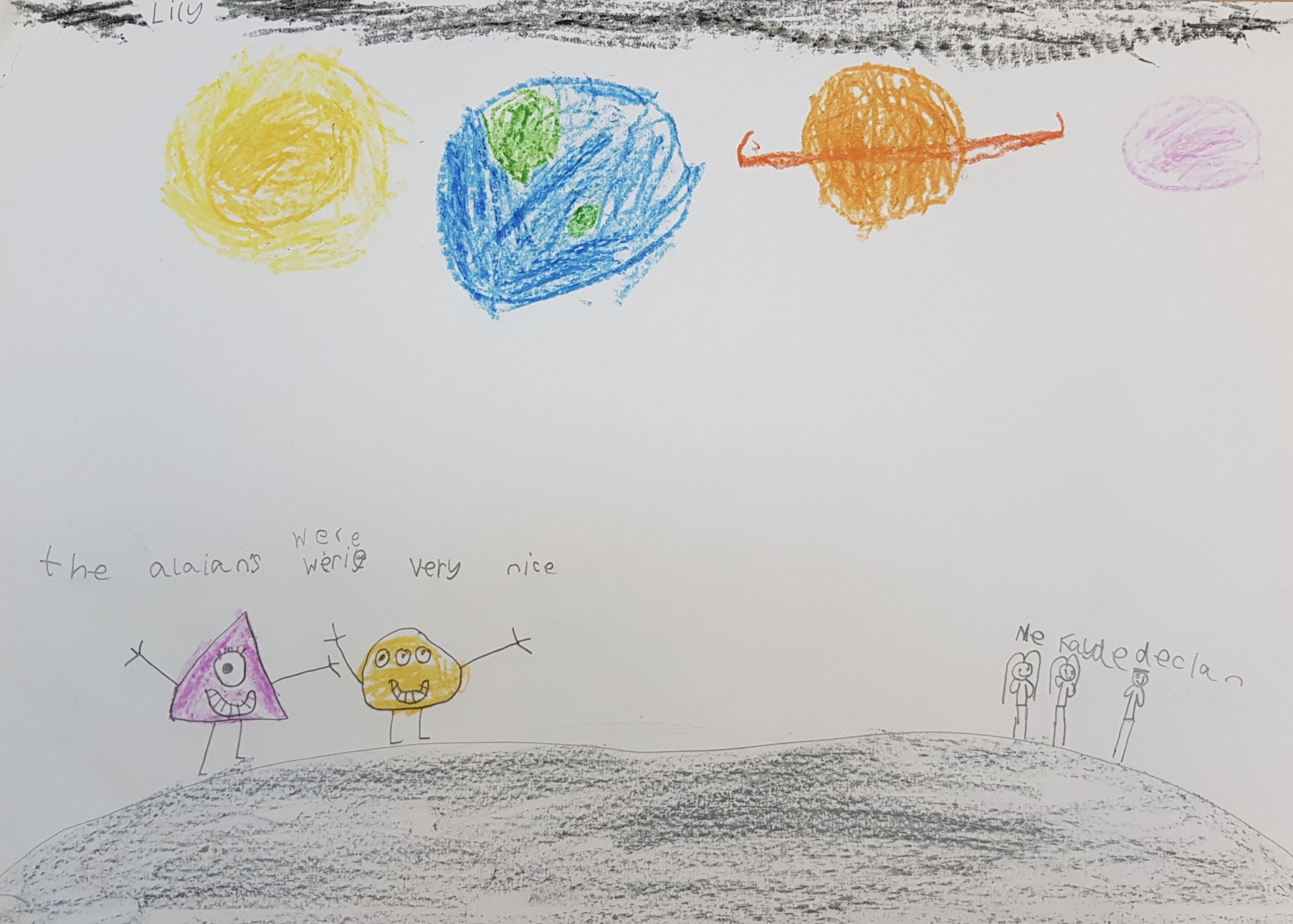 “I saw a dragon on the mountain & an alien. We found a sea and I felt brave! The dragon creeps up on us!”