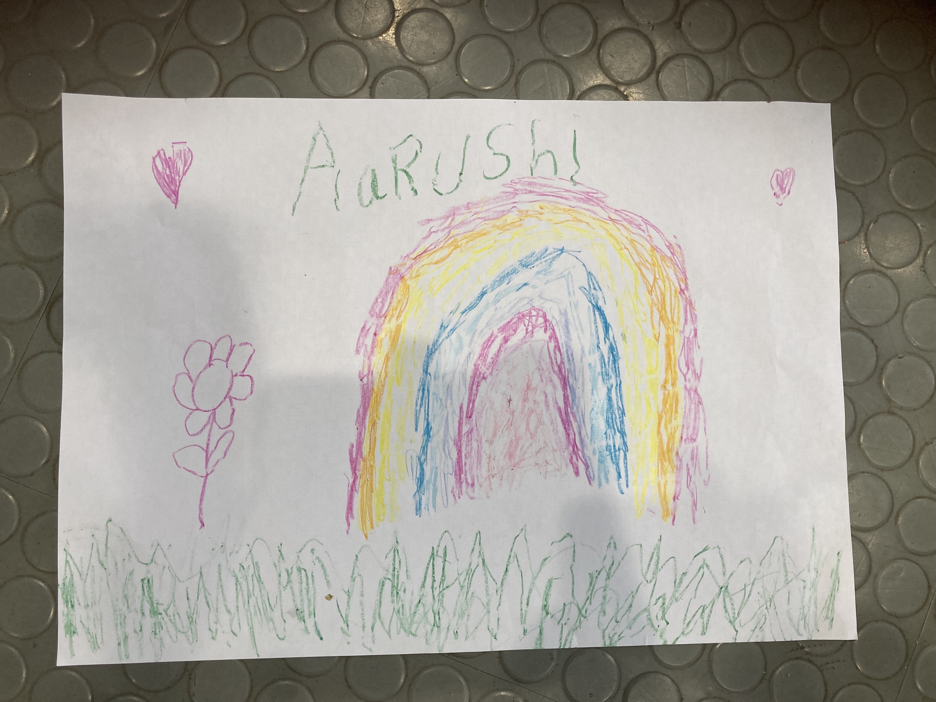 ‘This is the rainbow, flower and grass. Red orange, green blue dark blue purple and pink’