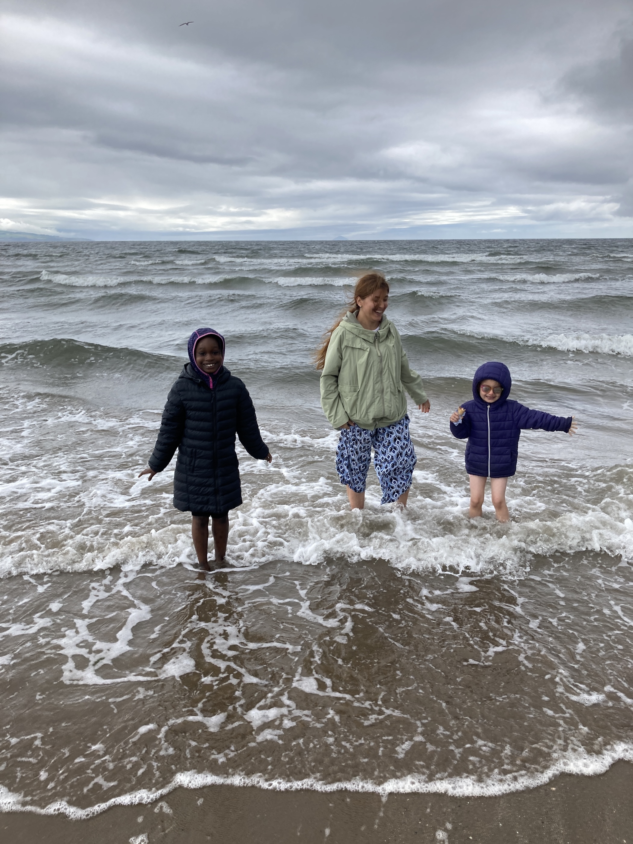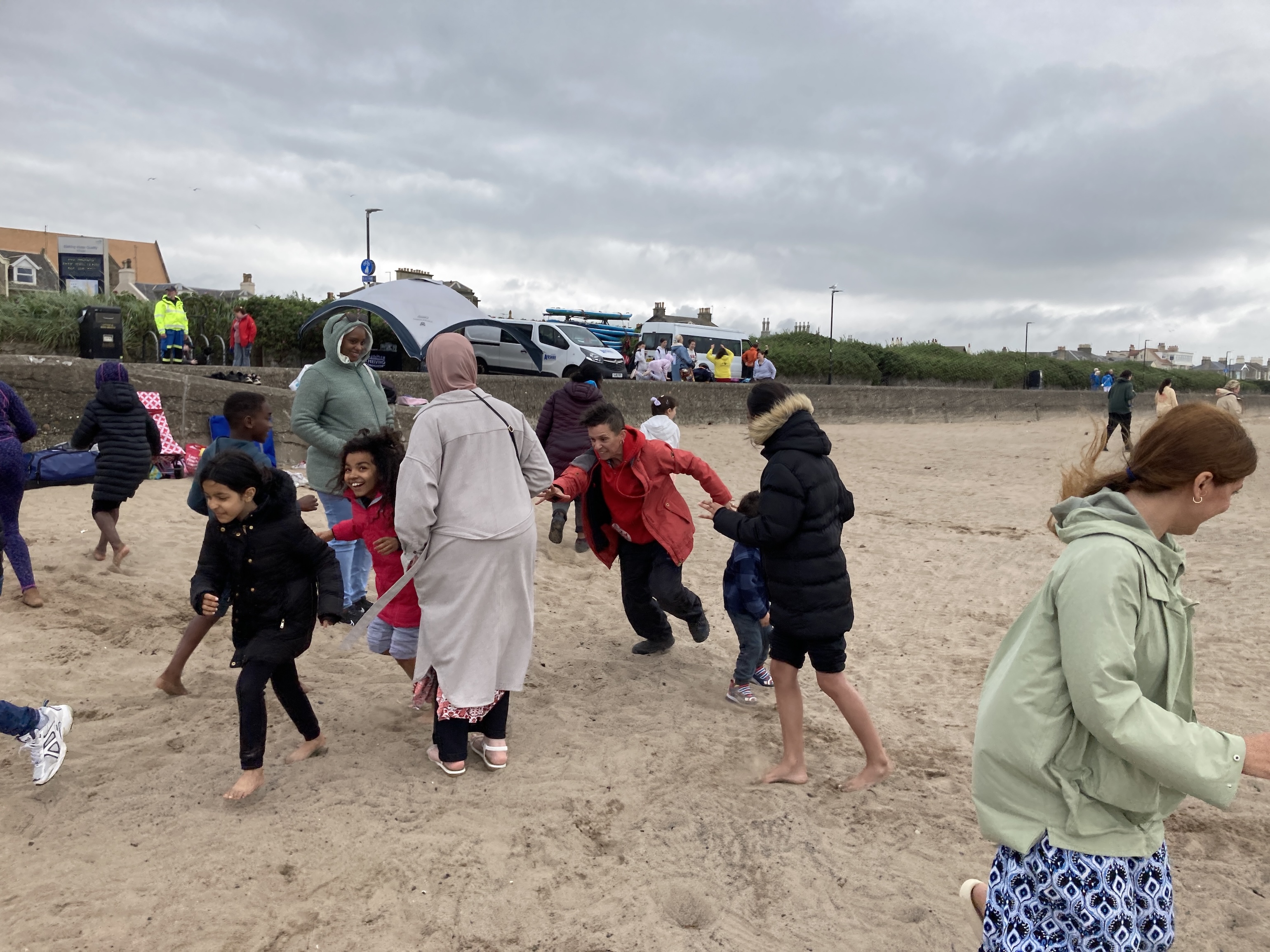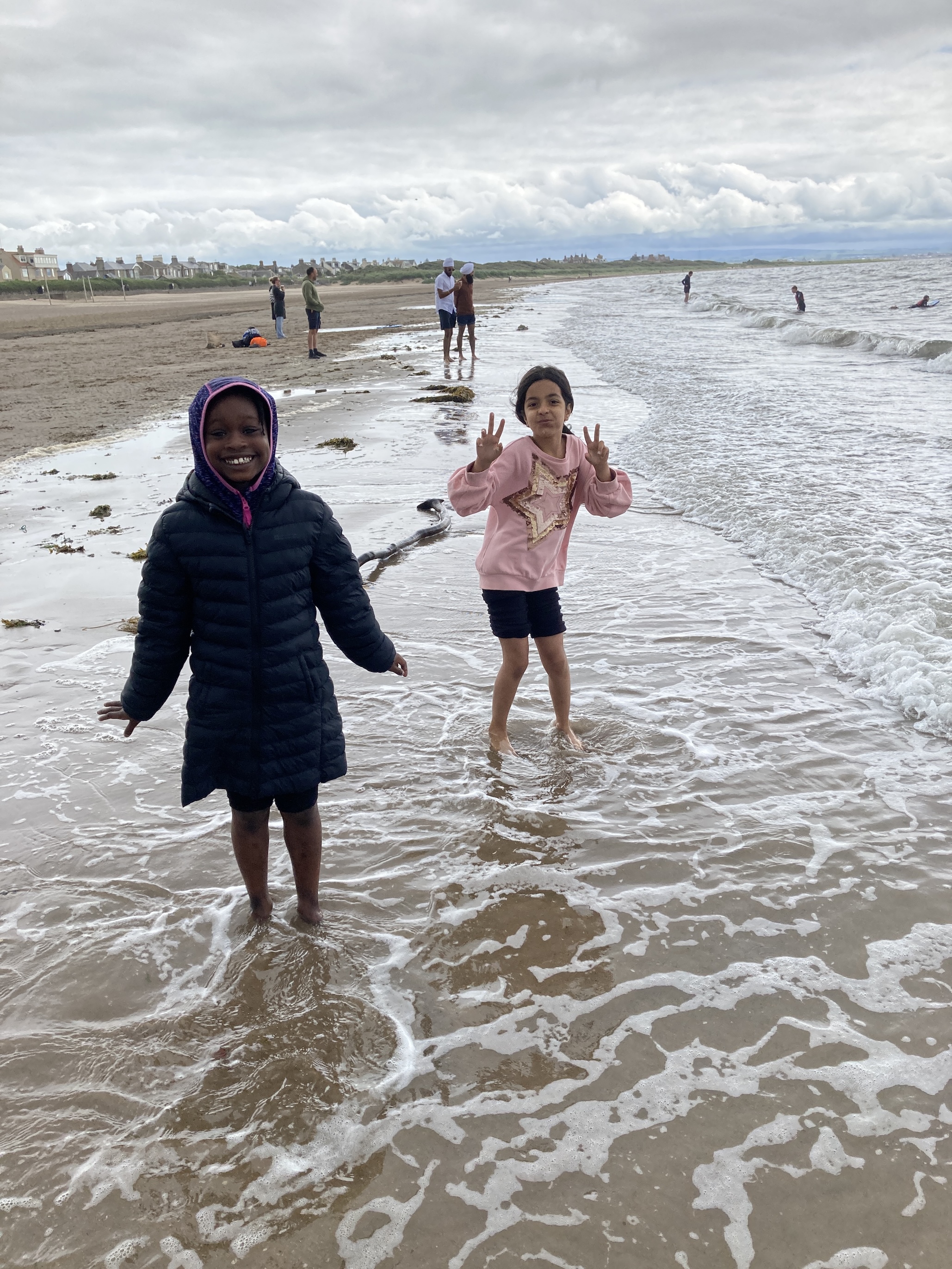 Shaylin and Gabriella couldn’t make up their minds. One minute they were jumping waves and the next running away from them! Maha decided after a while that she was going to get in the sea too, but Adam was not convinced, and he just decided to look at all the dogs playing around on the beach and feed muffins to the seagulls!