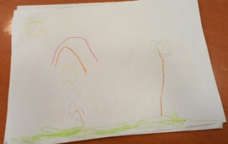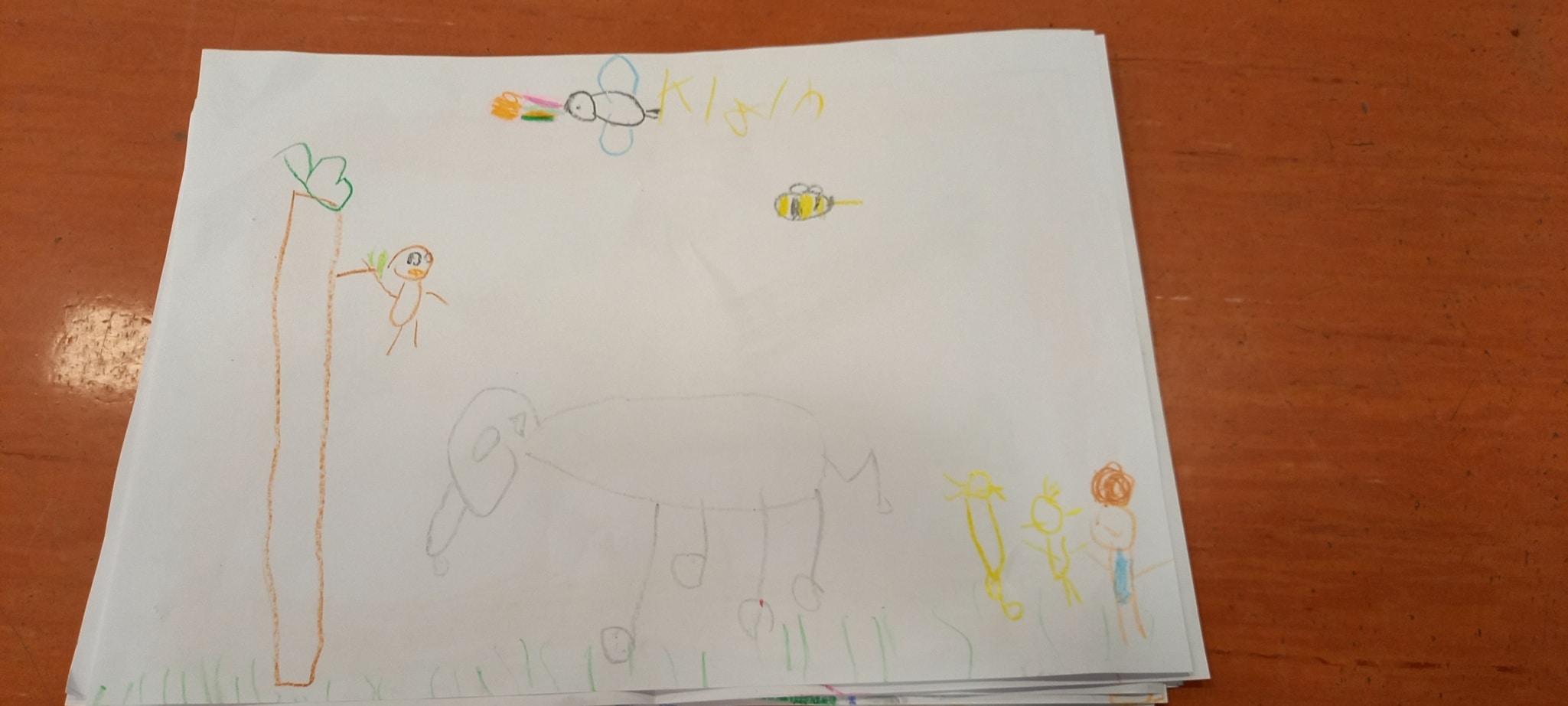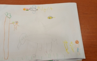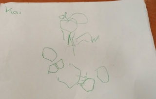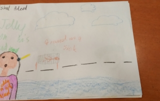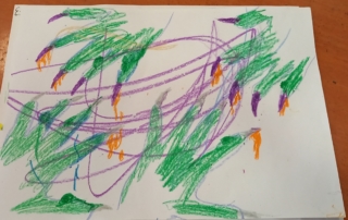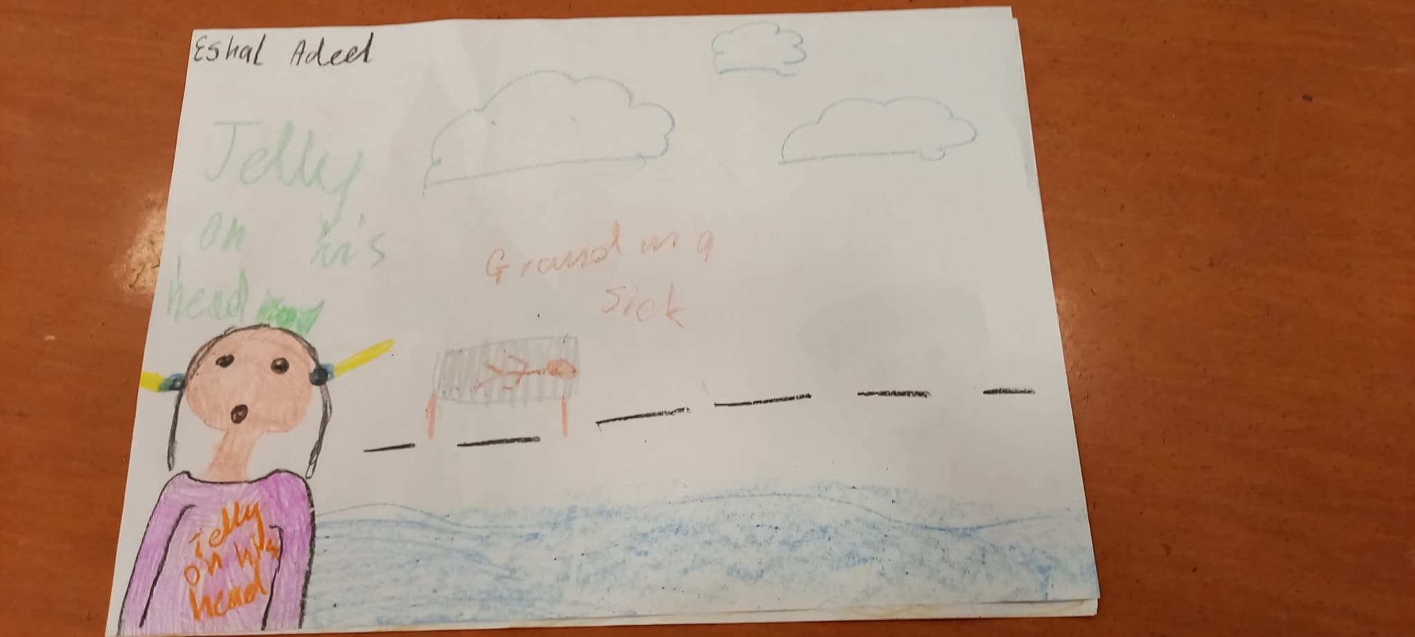 Ameerah made up a new verse for Jelly on His Head about Eve with ketchup on her face! And during the Licketyspit Art Gallery we found out that Kian knows so much about animals! He drew a toucan which is a kind of bird from the Tropics and also a pair of meerkats. Levi decided he wanted to make a paper airplane with his drawing to give to Kai.