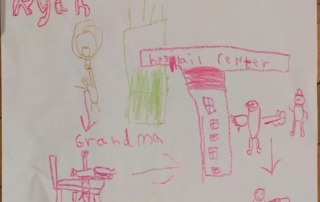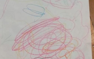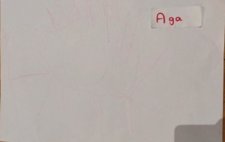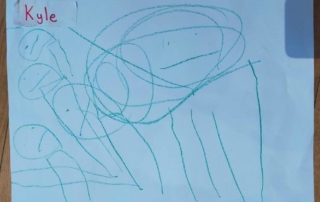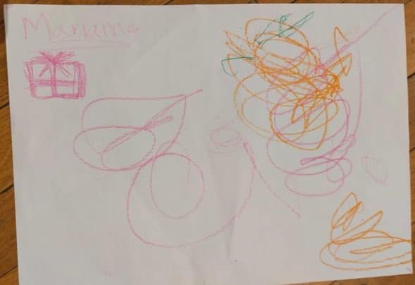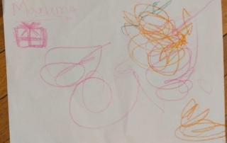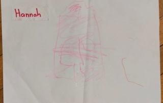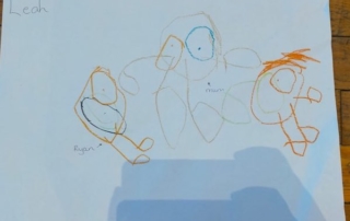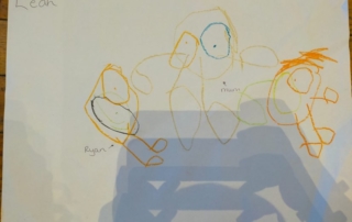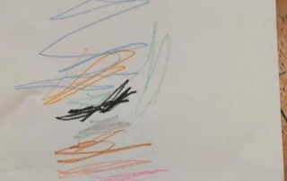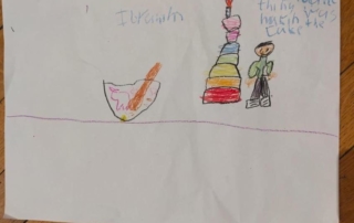 I drew flying up in the balloon and I drew a pheridactal and I made a mistake on his name *giggles* and I drew a fire breathing dragon with a streak in his hair. And I drew heart six because my age is six and I heart all of you. My favourite part was the grandma!’