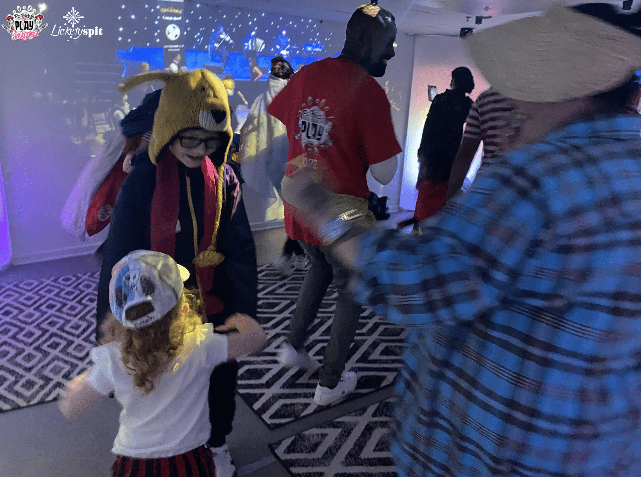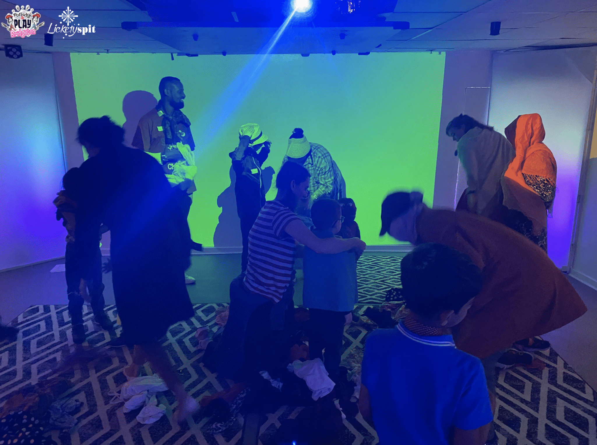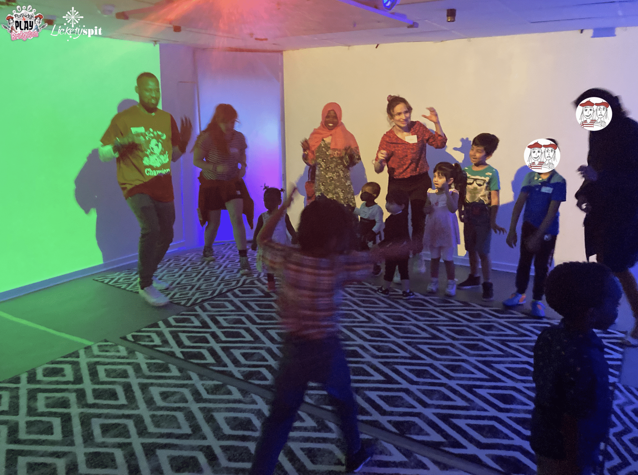 ‘This is the room, the green the red the colours. This is all the people in the circle, and we’re doing The Funky Chicken. That’s my favourite game’ – Ayyan