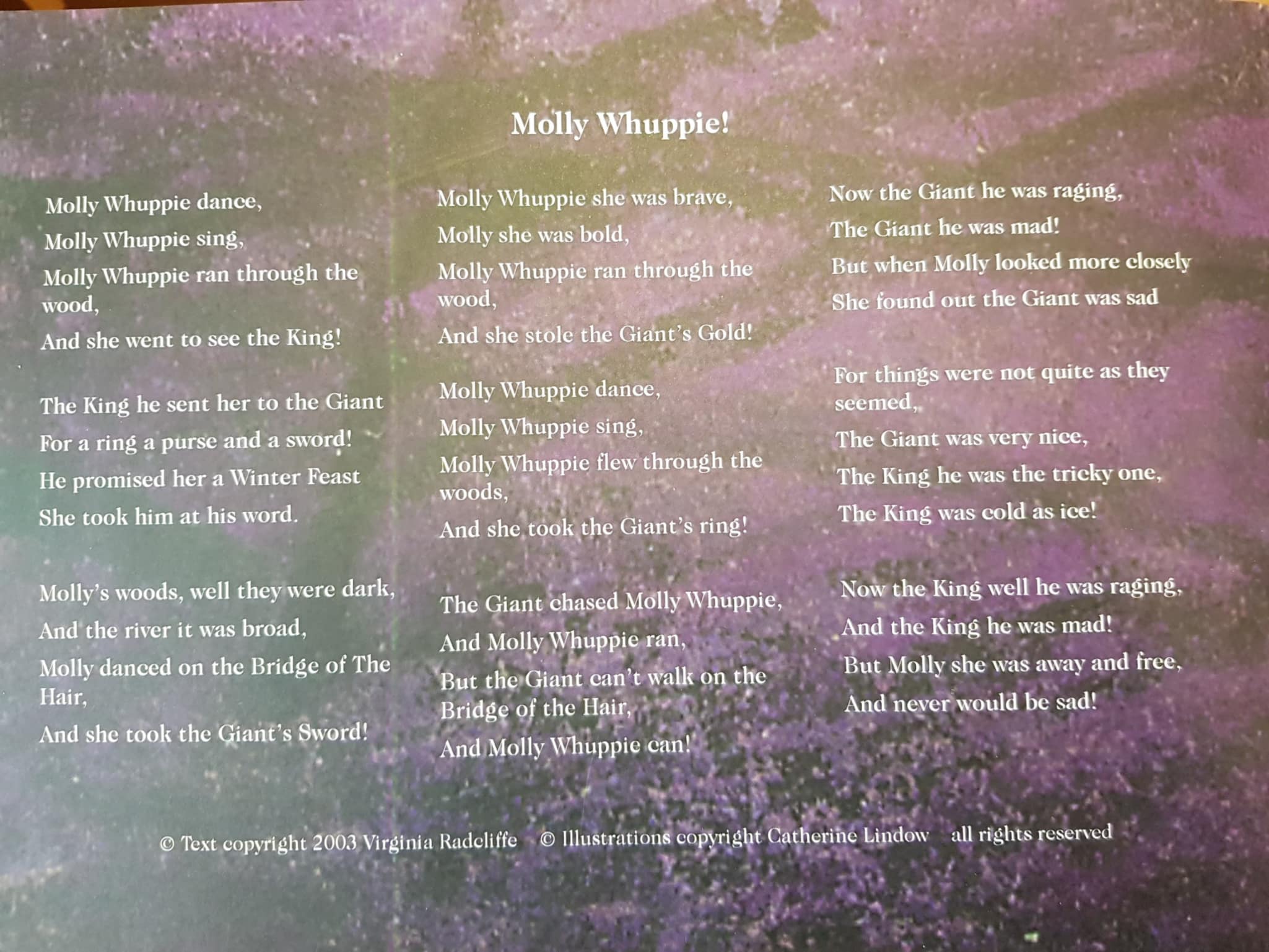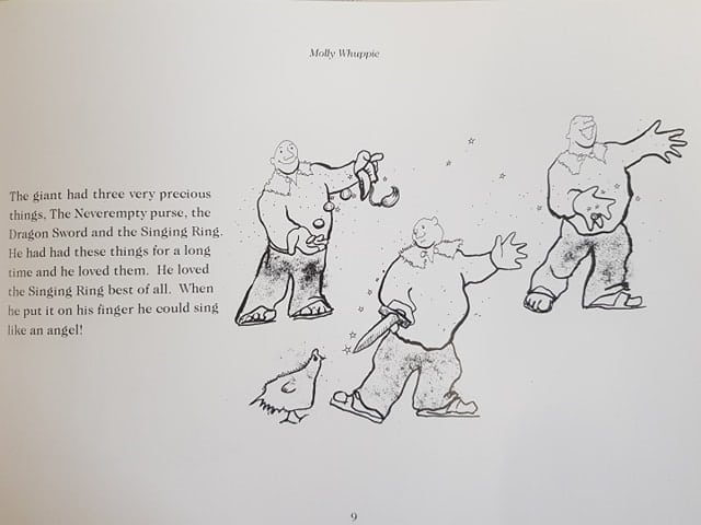 “Once upon a time there was a little girl called Molly Whuppie. She lived in a house beside the sea with her Mother and her sister Ella. They played games like tig, hide ‘n’ seek. They sang and they danced. They paddled and they swam. They built sandcastles and sand-mermaids and they told each other poems.