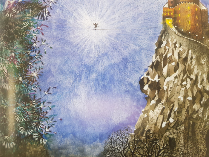 “Molly’s little house was at the edge of the Great Mountain and the Great Mountain was covered with thick forest. One day Molly climbed to the top of the tallest tree beside the house and looked up. Suddenly, for the first time, she saw a castle, at the top of the mountain. She could just see its golden towers peeking out over the treetops…”