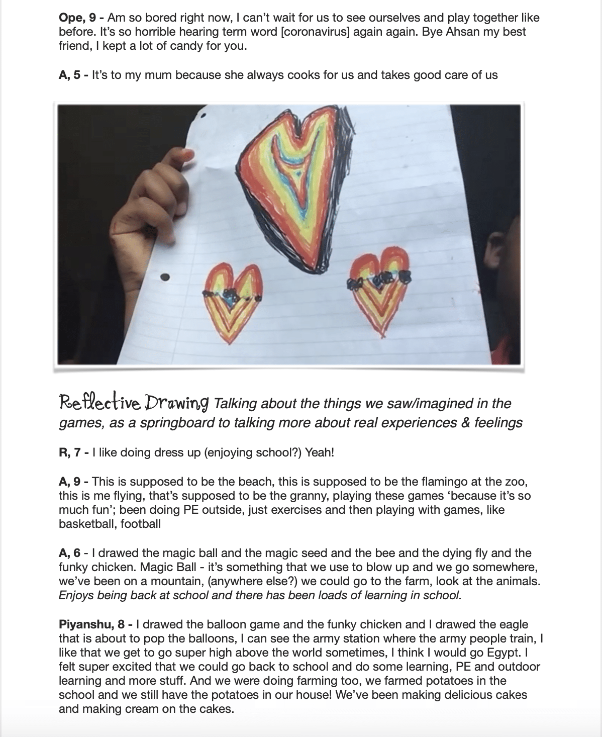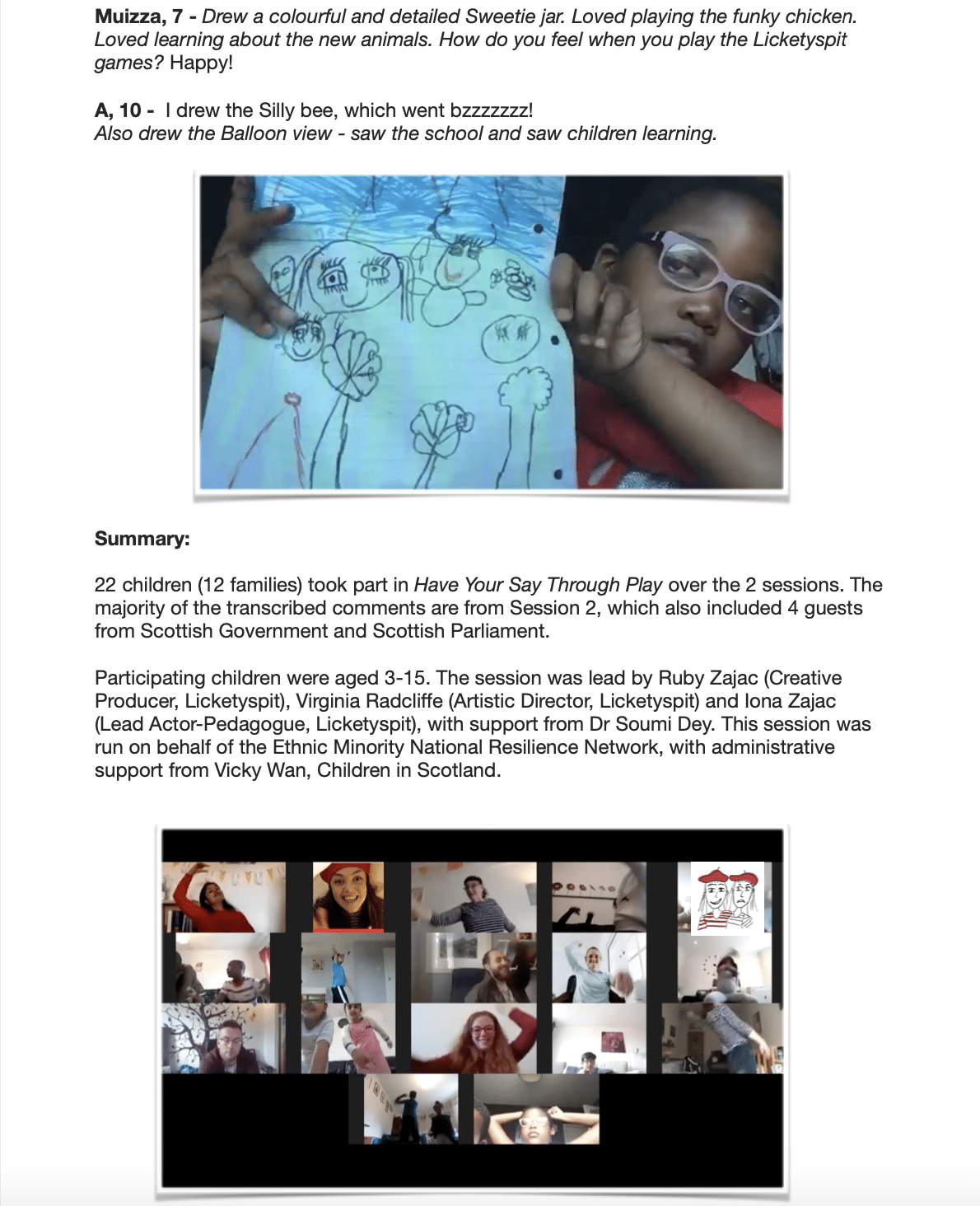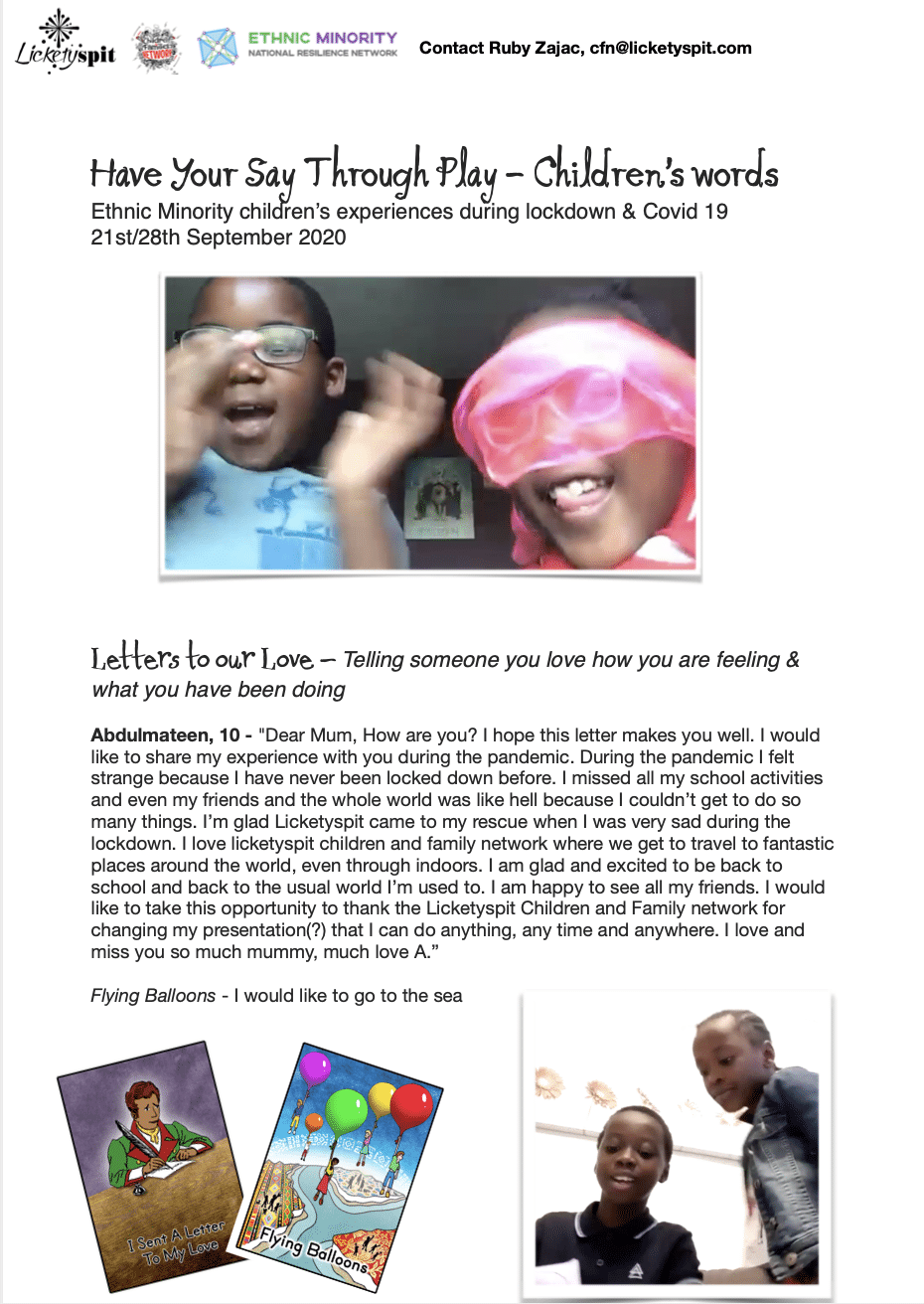 Have Your Say Through Play was developed by Licketyspit and our Children & Families Network in September 2020, as a model for play-based consultation with 3-12s using the Lickety Playcard repertoire. With support from Dr Soumi Dey and the Ethnic Minority National Resilience Network, Licketyspit piloted this session model with 12 play champion children exploring their experiences of the Covid-19 pandemic, using the games Flying Balloons, Sent a Letter to my Love and Reflective Drawing.