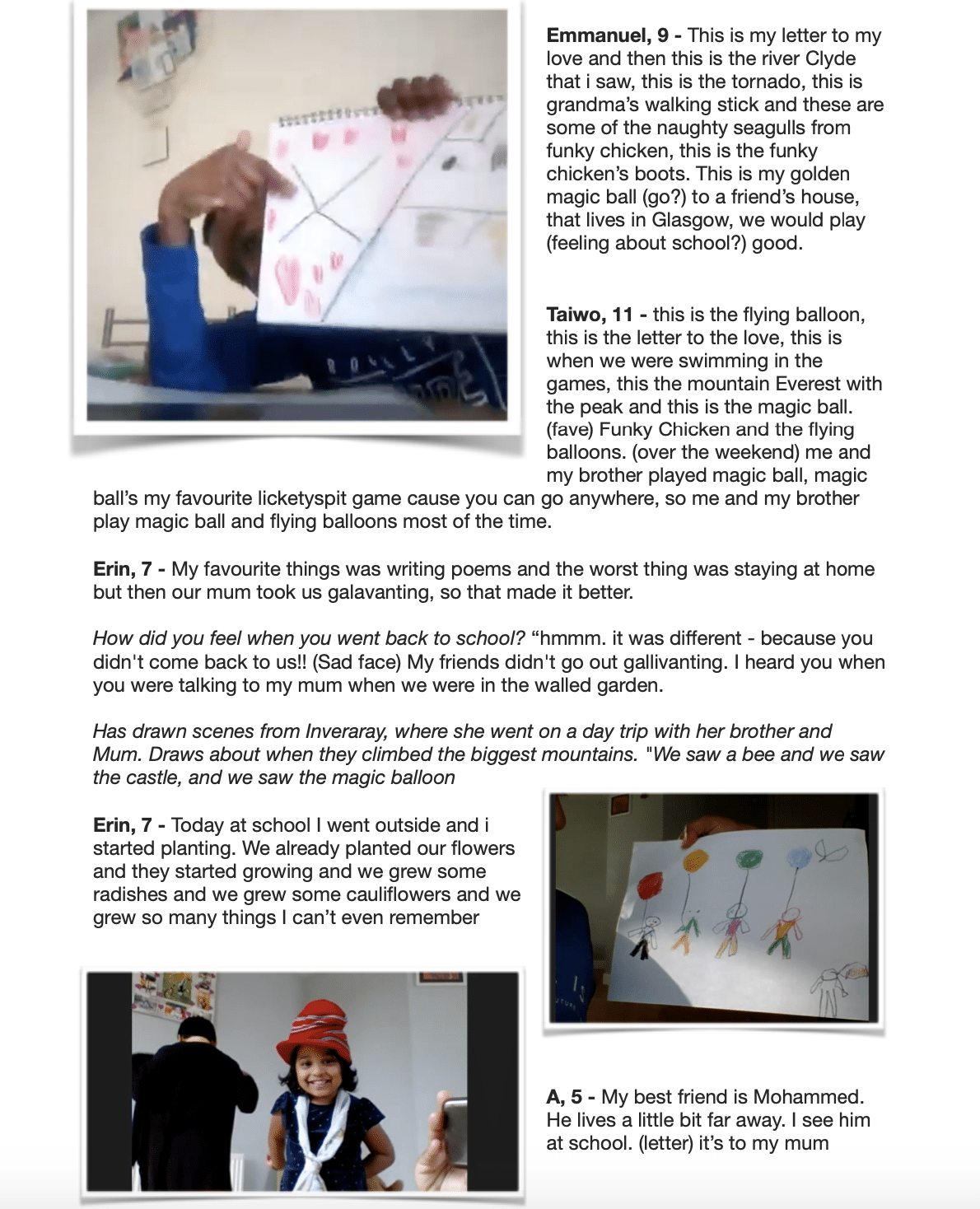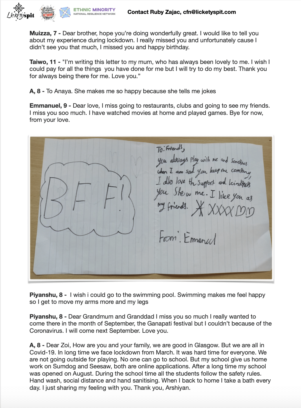 These are the responses which give a general sense of how the children dealt with the lockdown and how eager they are about returning to school and getting companionship from their Licketyspit sessions.