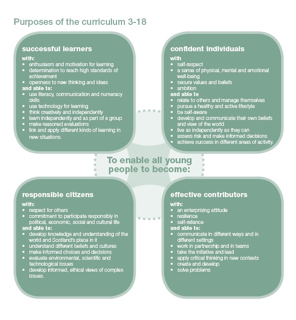 The Curriculum for Excellence is an educational framework for Scottish Schools. It is ‘intended to help children and young people gain the knowledge, skills and attributes needed for life in the 21st century, including skills for learning, life and work’. The curriculum focuses on children between the ages of 3 – 18.