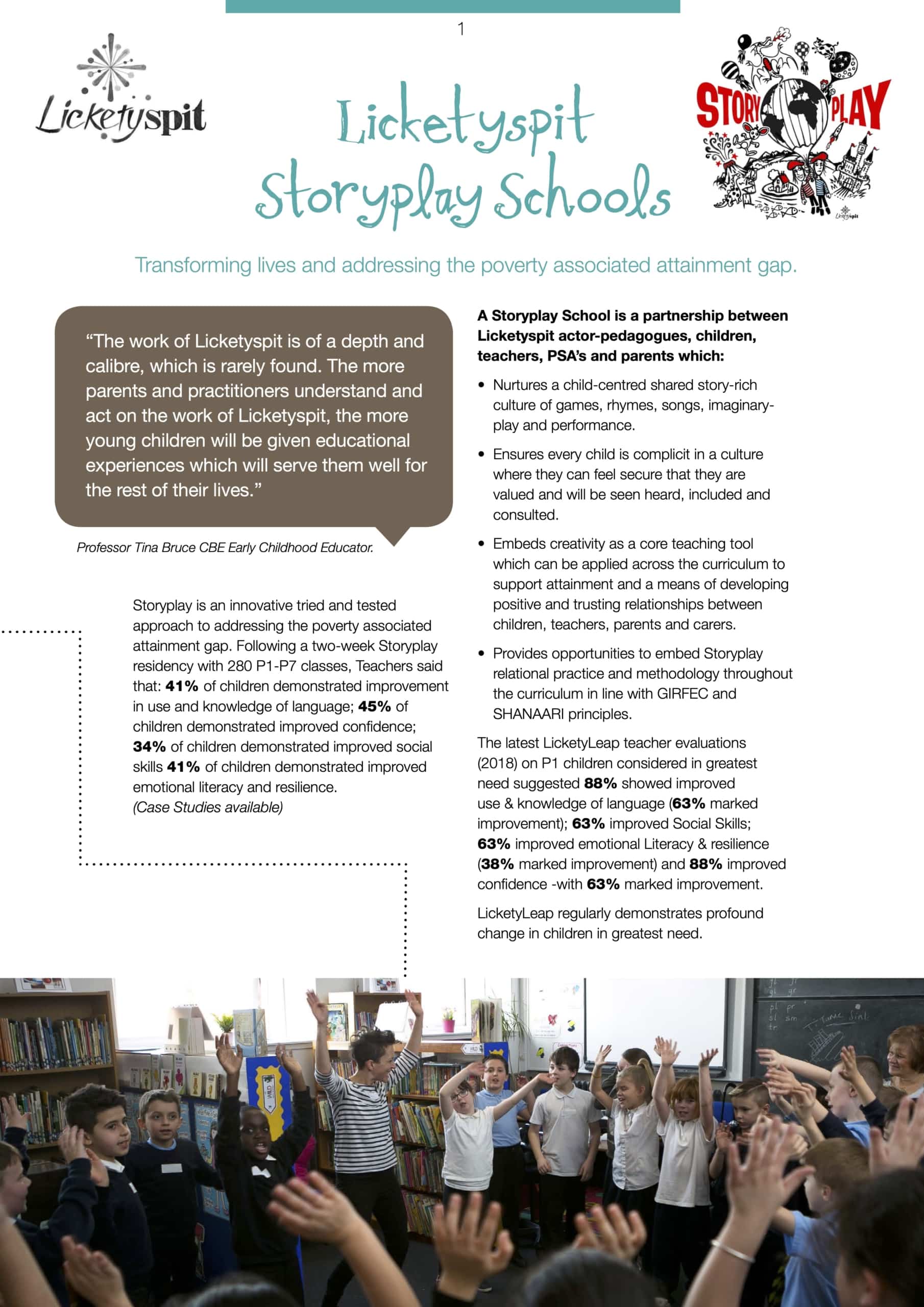 Licketyspit has a unique theatre in residence project called Storyplay Schools – where Licketyspit forms a long-lasting relationship with the school and school community, using drama and drama-led play to create culture of shared stories and reciprocity, rooted in the aims of the Curriculum for Excellence, which complements the school’s ambitions and supports their work to address the poverty associated attainment gap.