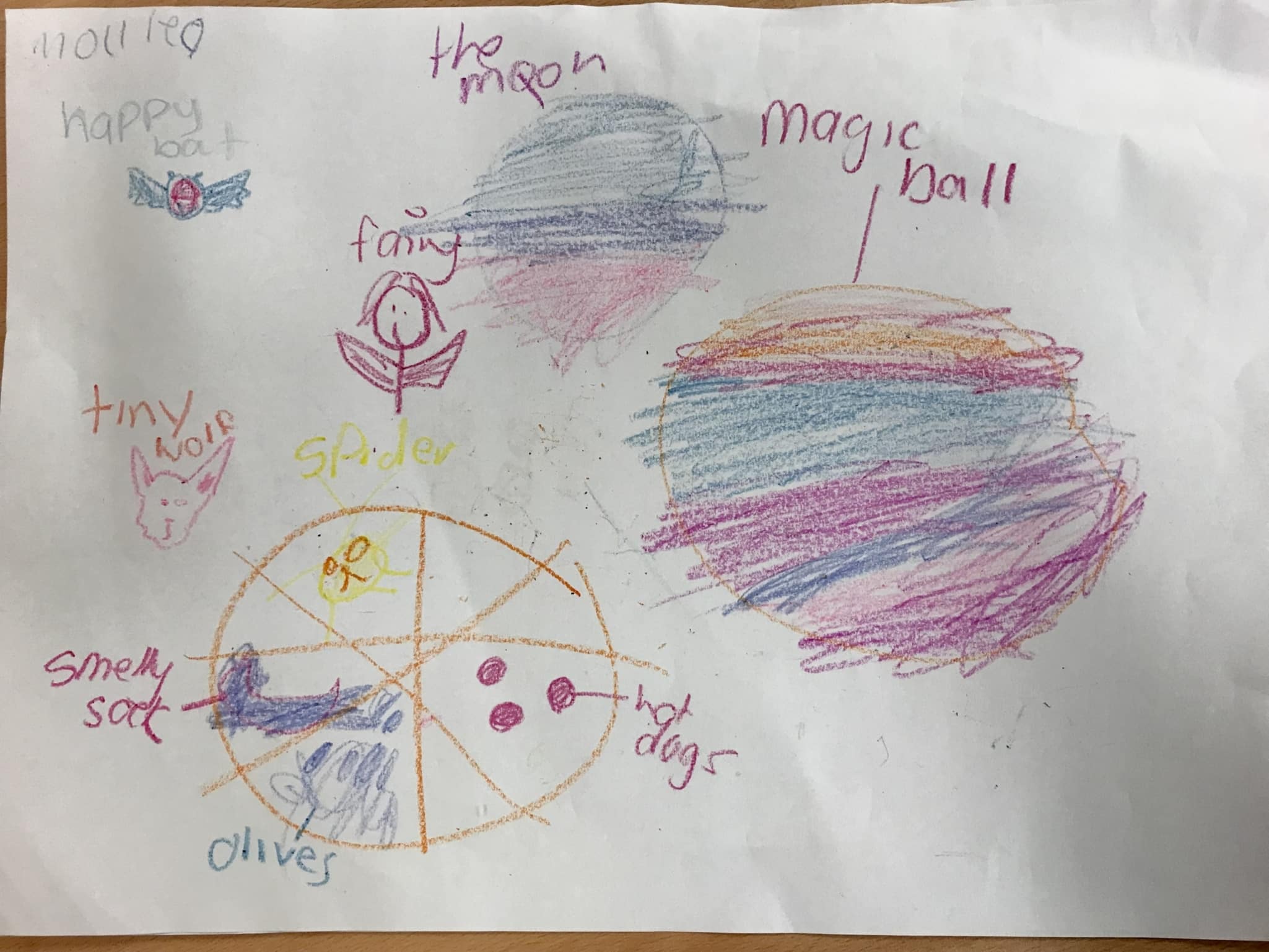 Then we found a pack of food and shared it – there was pizza with smelly socks, olives, cobwebs and hot-dogs. We all started to feel sleepy then, a bit like the bat, and had some weird and wonderful dreams. Jamie said a spider chased him and made him drink a creepy potion. Gabby dreamt of a magic Unicorn. Sean said a big pumpkin was chasing him and gave him magic powers. David was a German Shepherd chasing a bad guy. Then we woke up and couldn’t find The Magic Ball so we had no way of getting home. We were wondering what to do when the Spirit of the Forest came and gave us a Magic Light which we pressed once and suddenly we were transported to the Moon. On the Moon, we found a Spaceship and needed to shrink to get into it as it was so tiny! We drove the Spaceship and it took us to Fairyland where there were fairies and bugs dancing and the fairies were watching tv and getting ready to go on holiday to earth.