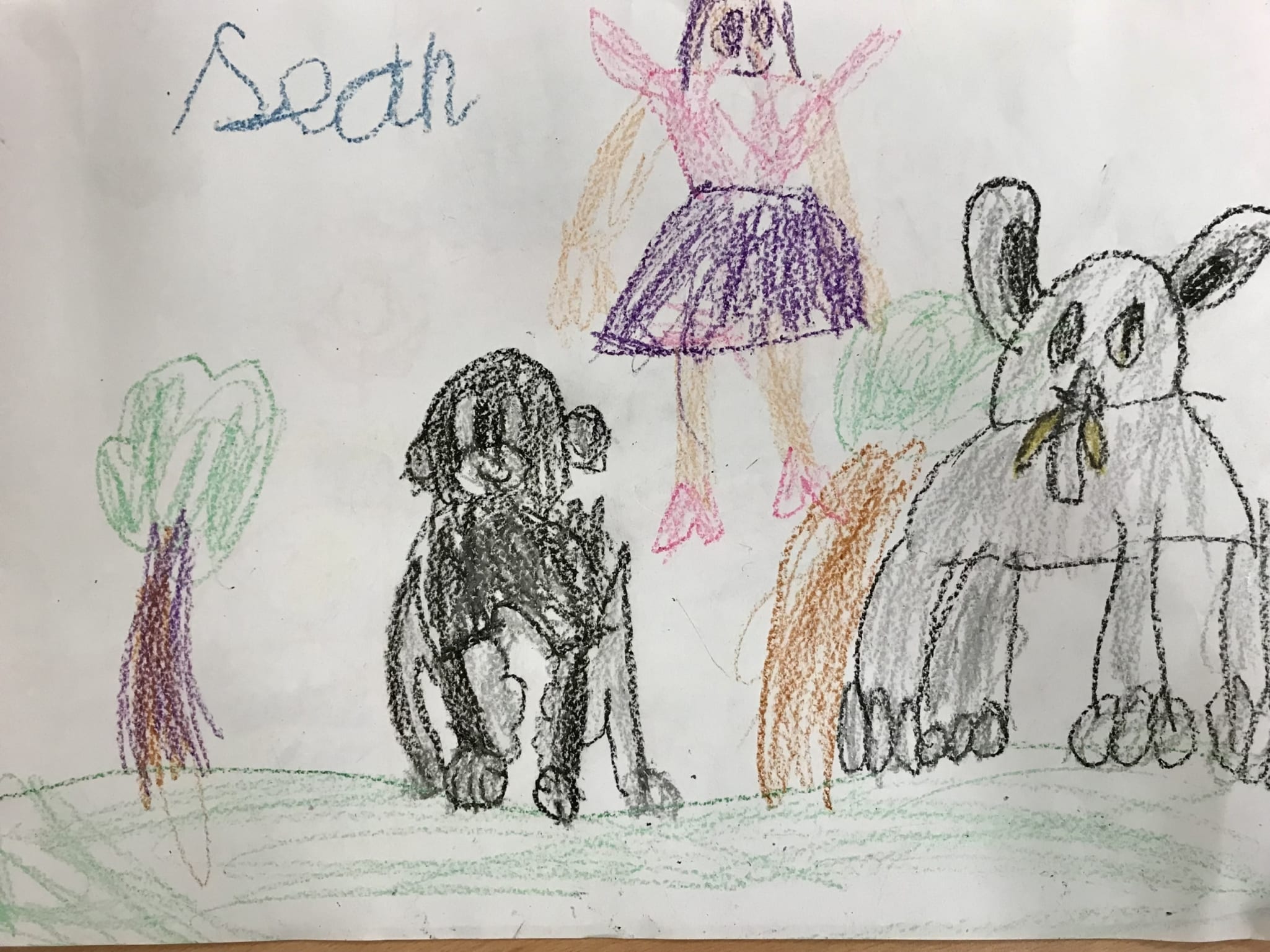 Just then we looked up and there, up high in a tree, was the lesser-spotted Emmanuel bird who was enjoying some worms. He was perched above Sean, the gorilla who ate human meat and Mohammed the tiger who just ate everything! The forest creatures, we discovered pretty quickly, were keen to know the time, as not one of them had a watch except the Wolves!