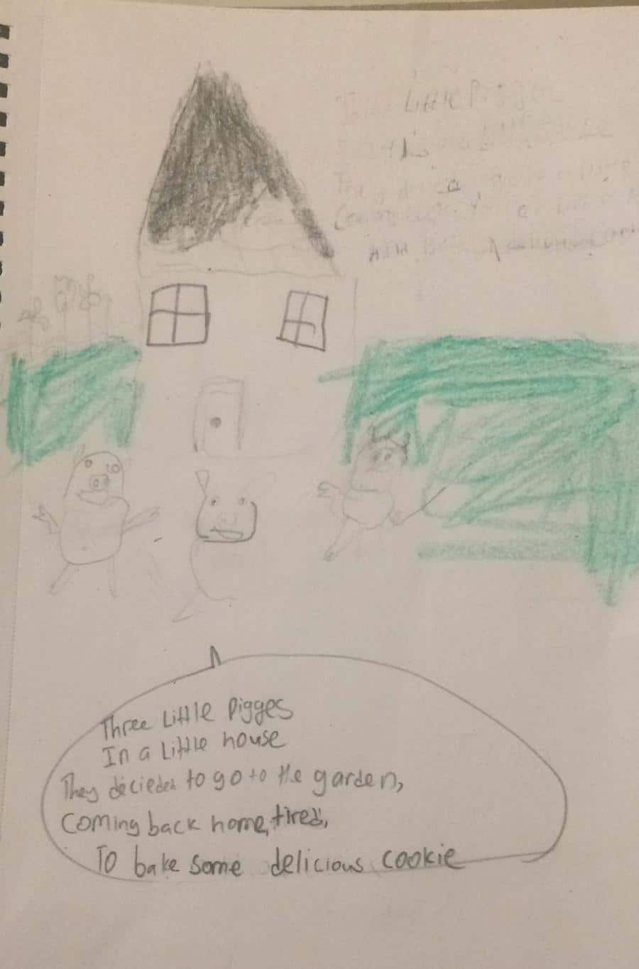 We met unicorns who were putting on their school uniforms and Yumna the parrot who was eating a carrot! Suddenly a princess fairy appeared who lived in a house that wasn’t scary, her name was Mary and she wasn’t very hairy!!! In the forest there was a little bird who heard a word!