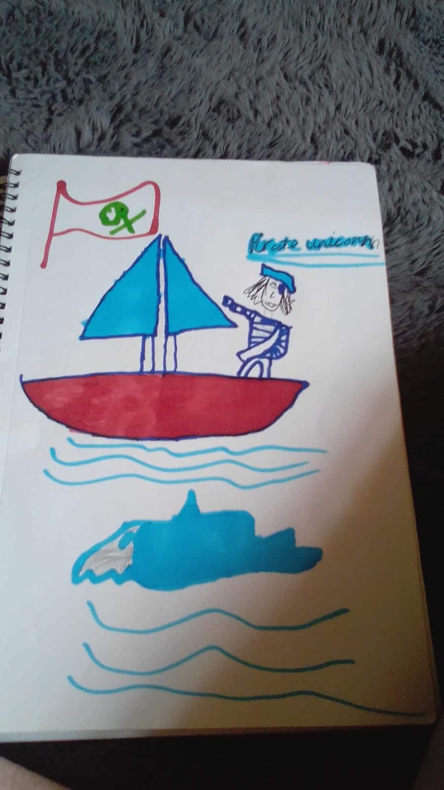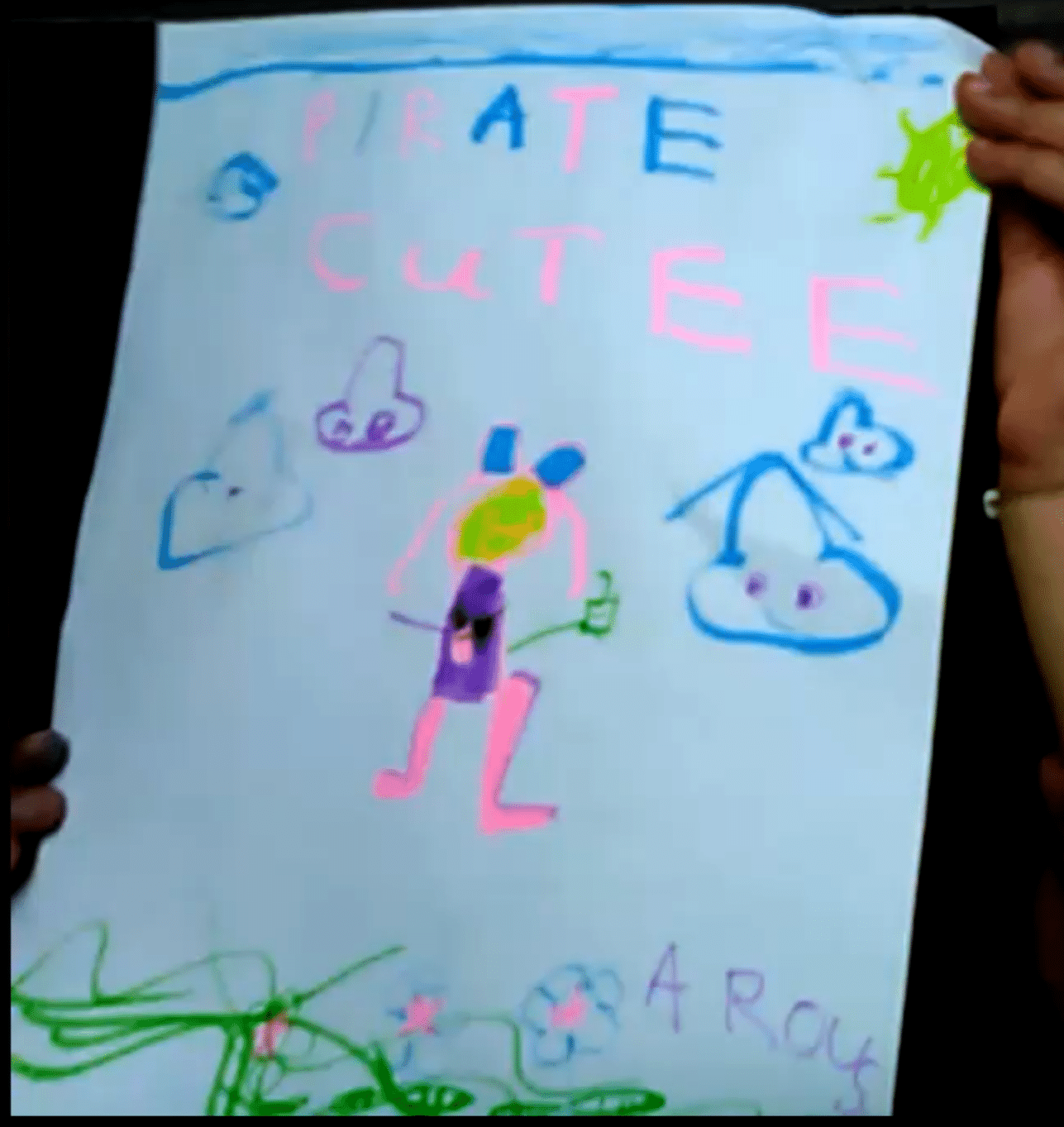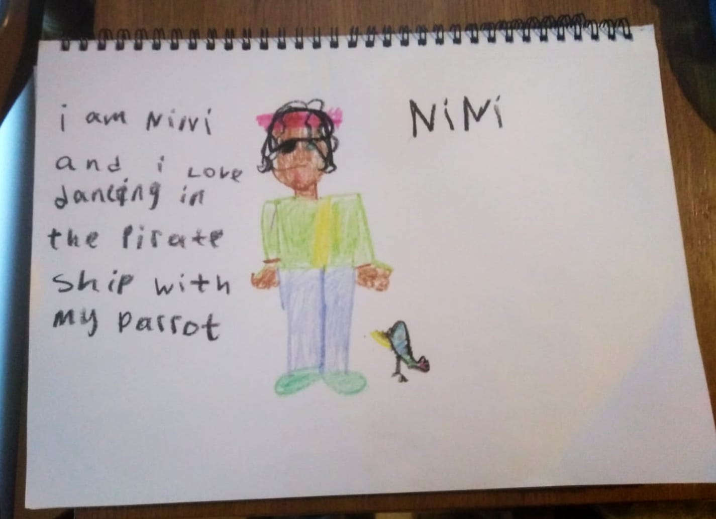 ‘Ok this is my drawing and this is me as a pirate but I changed the name and it is NiNi. I wrote like a little poem and it goes like ‘I am NiNi and I like dancing in the pirate ship with my parrot Slack!’