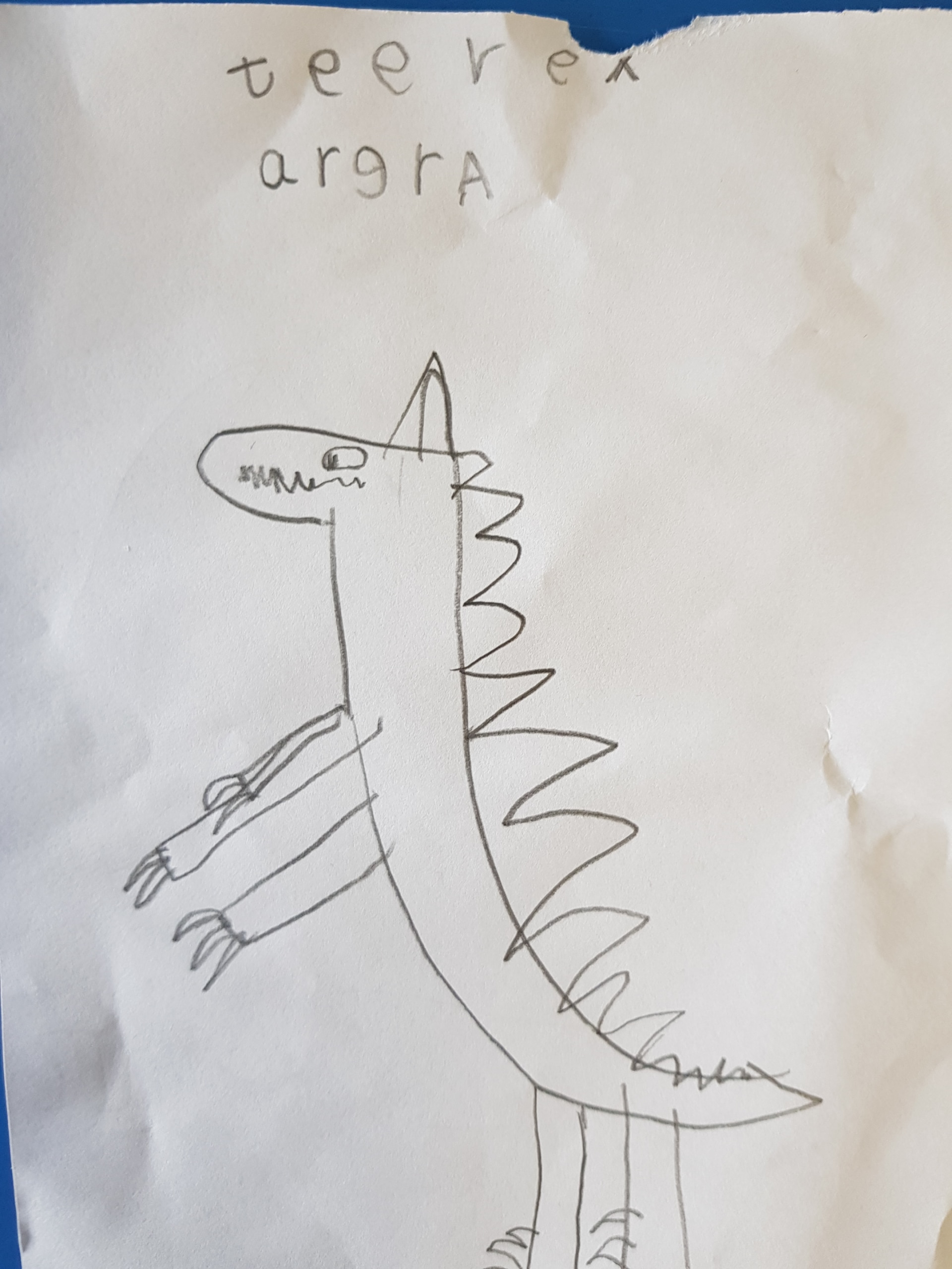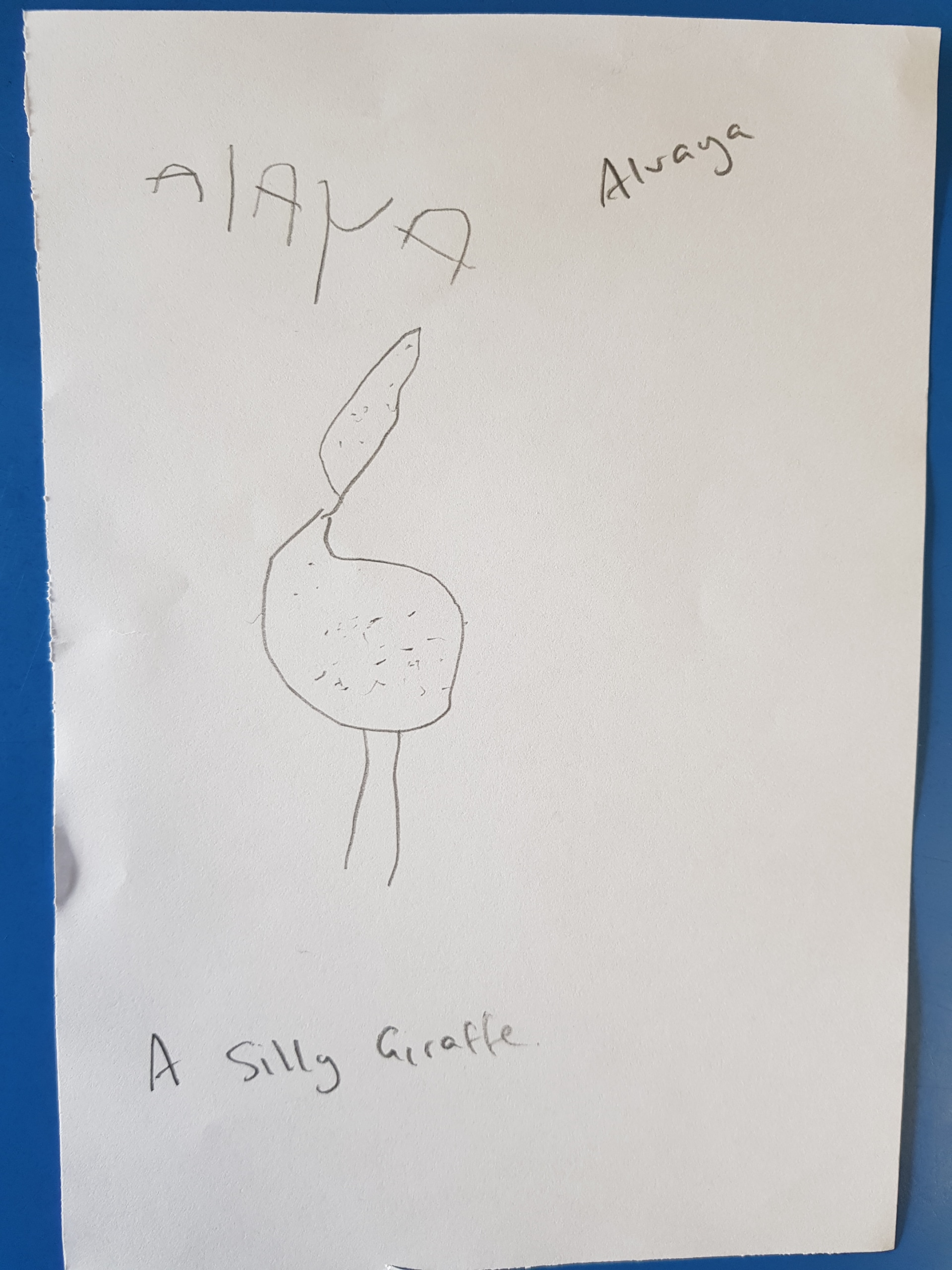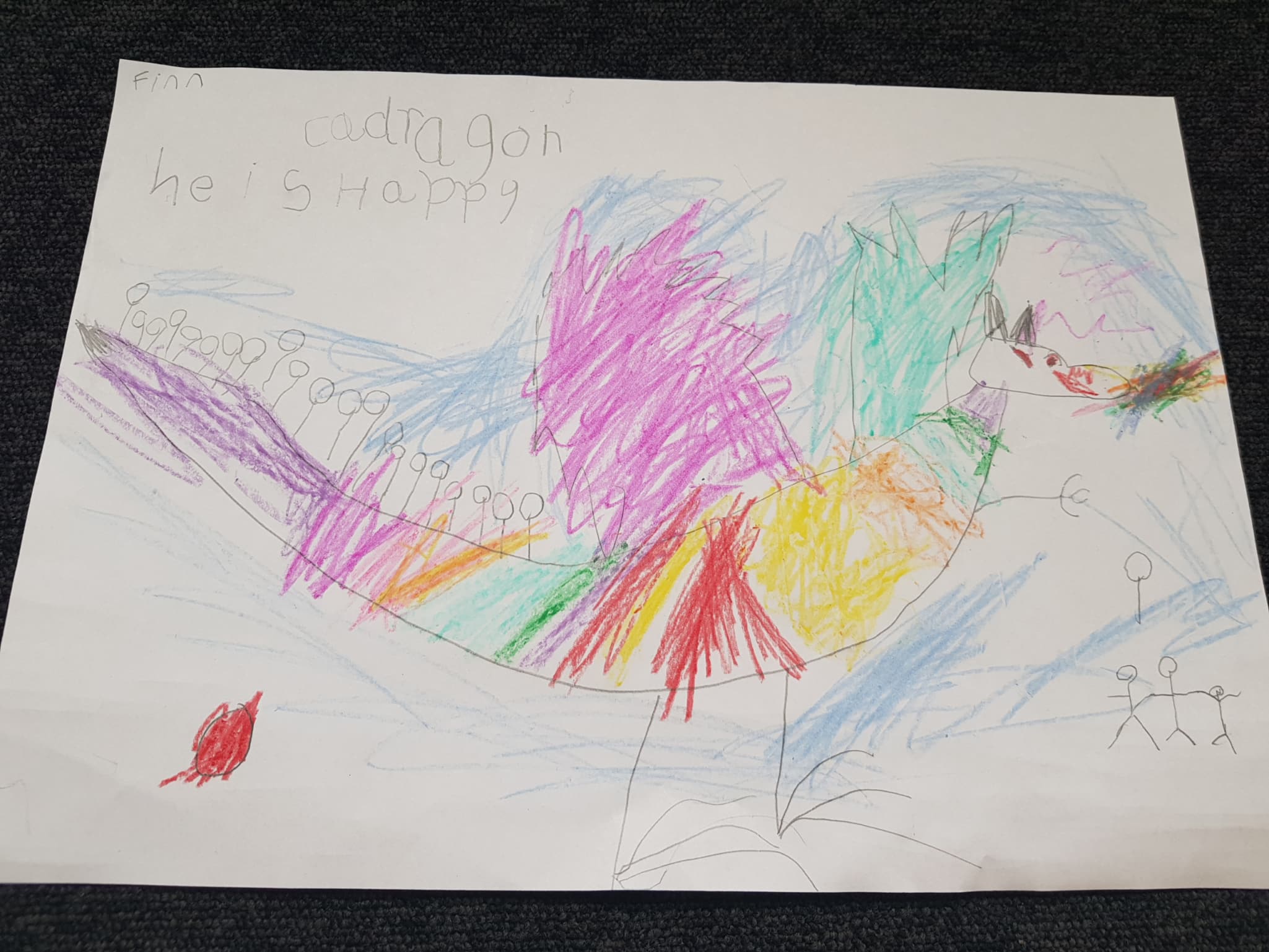 A snowman, a house on fire with the dragon family inside. A waterfall. A baby dragon. Fave – swimming, found a shark we had to get out it would eat us! I was an alien.
