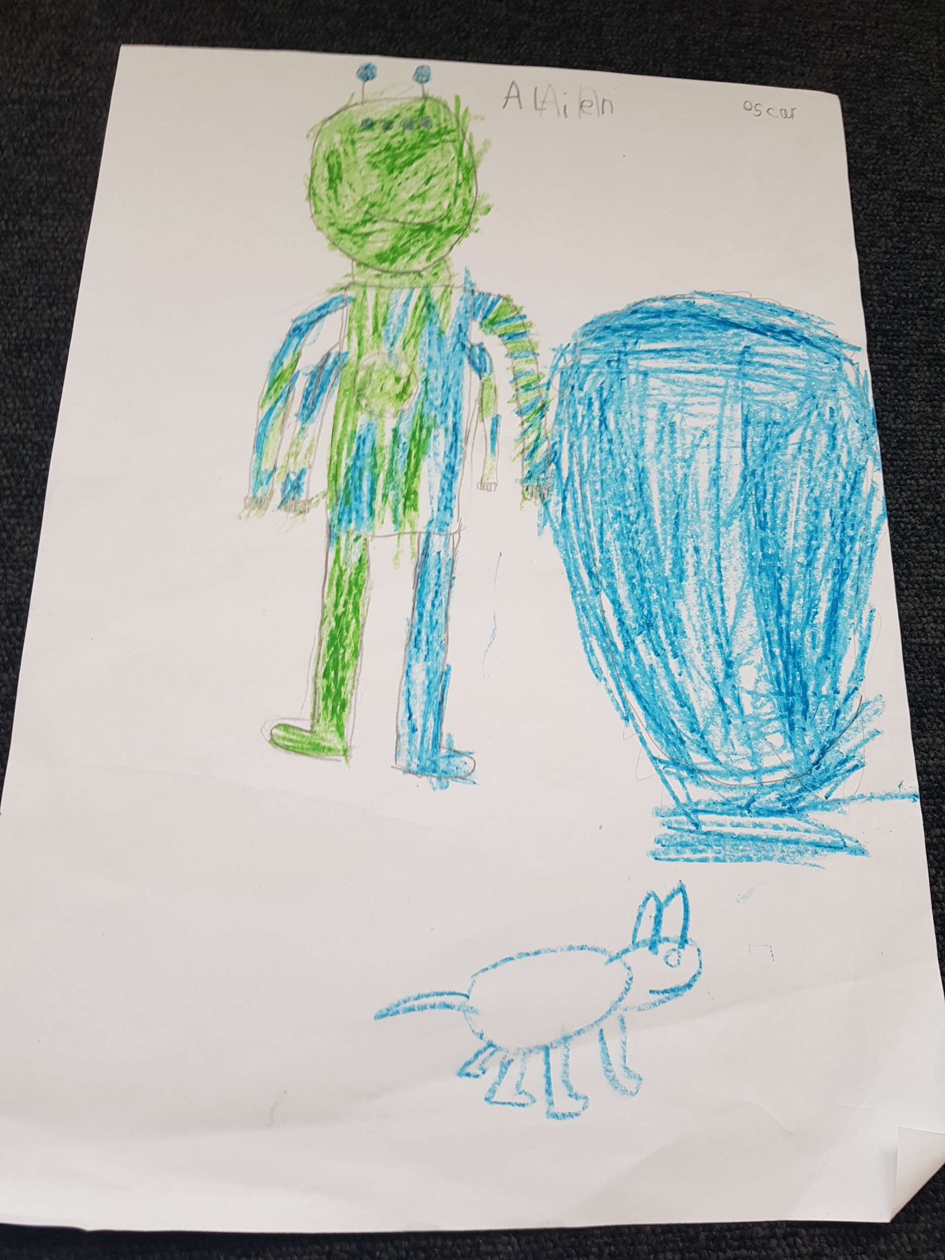 I drew a dragon, he is a good dragon, and a sad alien. He is sad because there was no space on the dragons back. There’s a storm and the dragon will fly away. Everyone is on the dragons back.