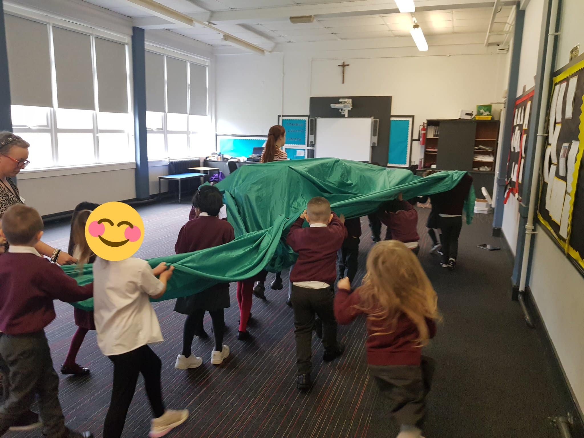 We flew off in our balloons – with suggestions we might see the beach, the jungle, aliens, cats…..! Mrs Reid saw the river and we saw some of our families and pets. Then a dragon flew over and let us climb on his back and we flew to the shores of a lake by a beach. It was an island covered in white flowers! Harry saw some ducks living on the island, Harlow saw crabs. Everyone swam in the lake and we found a statue and a rainbow treasure chest. Darceigh found the key! There were sharks too – eek! We all ate macaroni cheese, ice cream and juice handed out by different children.  Then we made the silk back into a dragon and flew back to school.