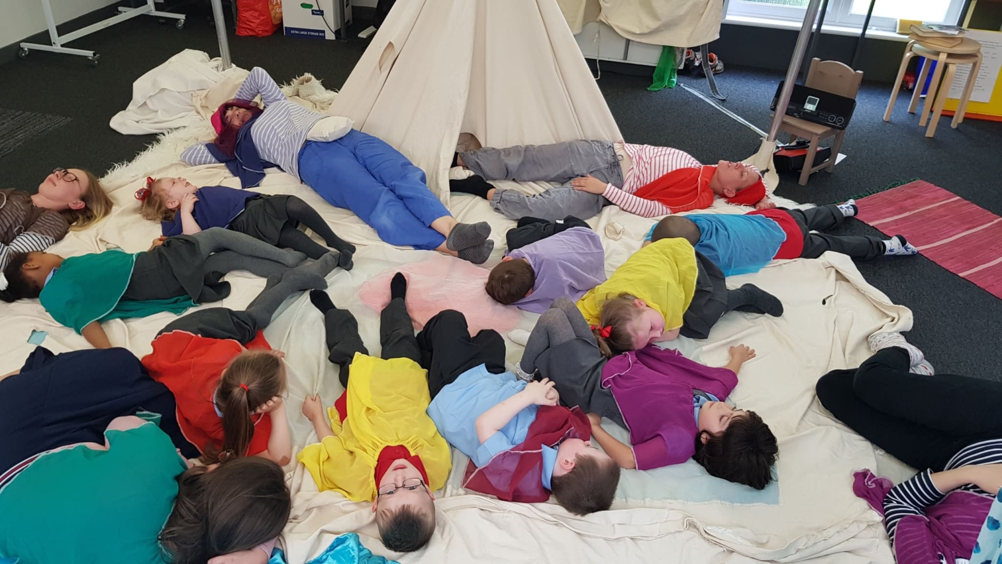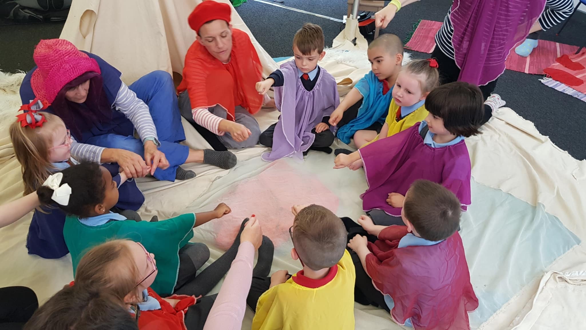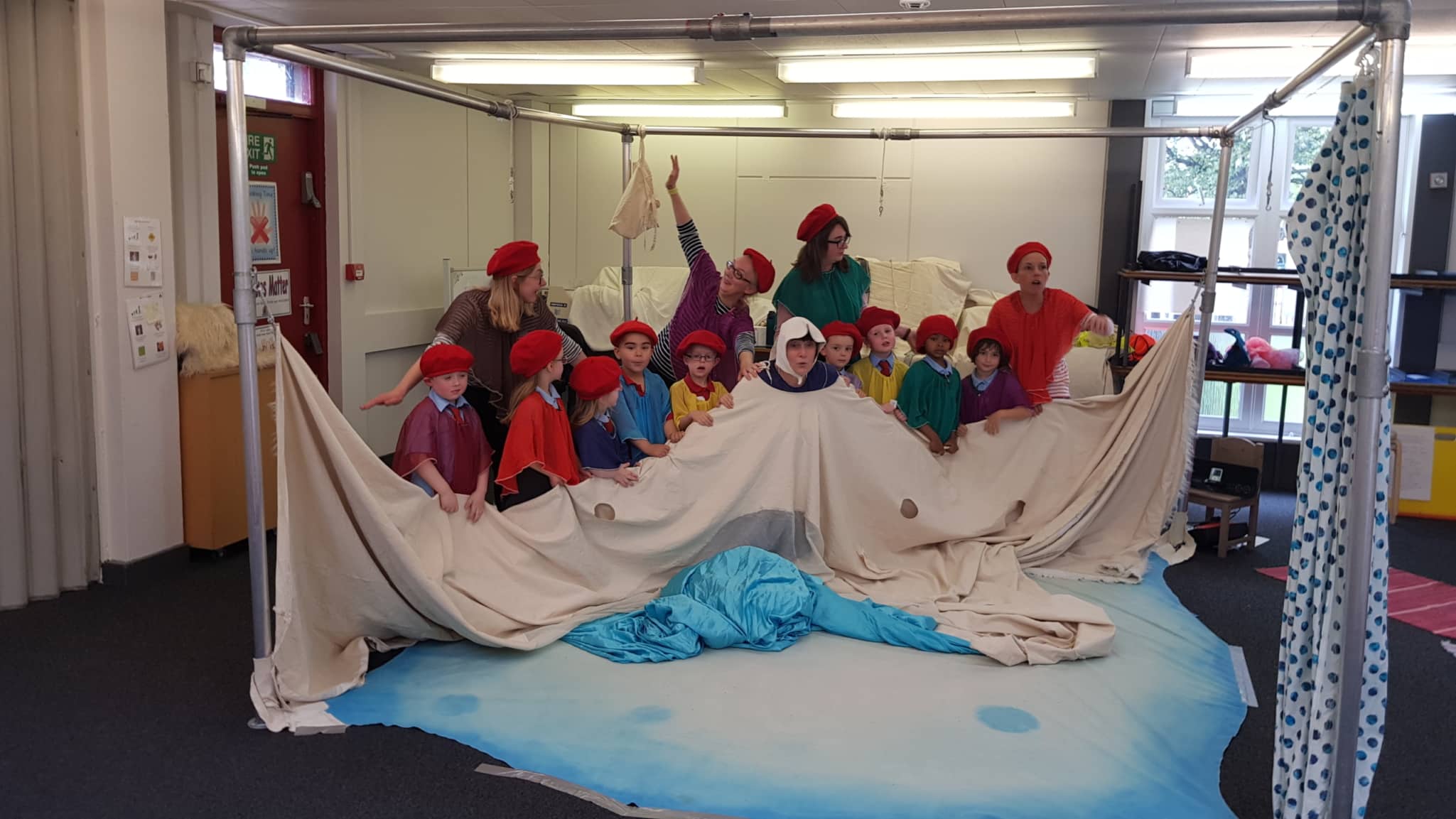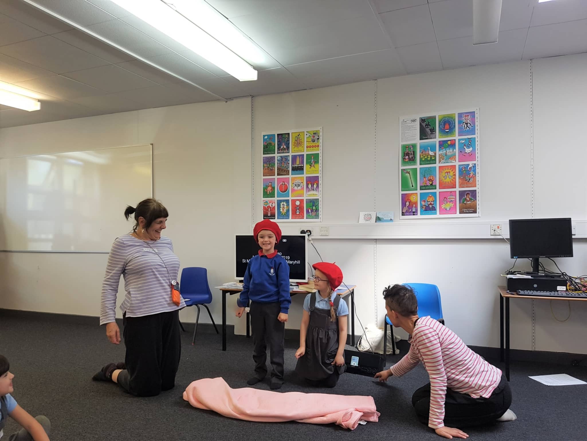 On the boat, everyone relished trying each other’s fish and M gave the Fishy Lady a hug goodbye. In the Cave we saw bats, and everyone boldly shouted their name to make an echo. When the Bear appeared, a couple of people were a bit nervous, but they overcame any fears and patted and hugged it! S articulately told Bold Margaret about the Bear. L asked the Bird for a lift and after we reached the top of the Mountain, other L suggested sliding down.