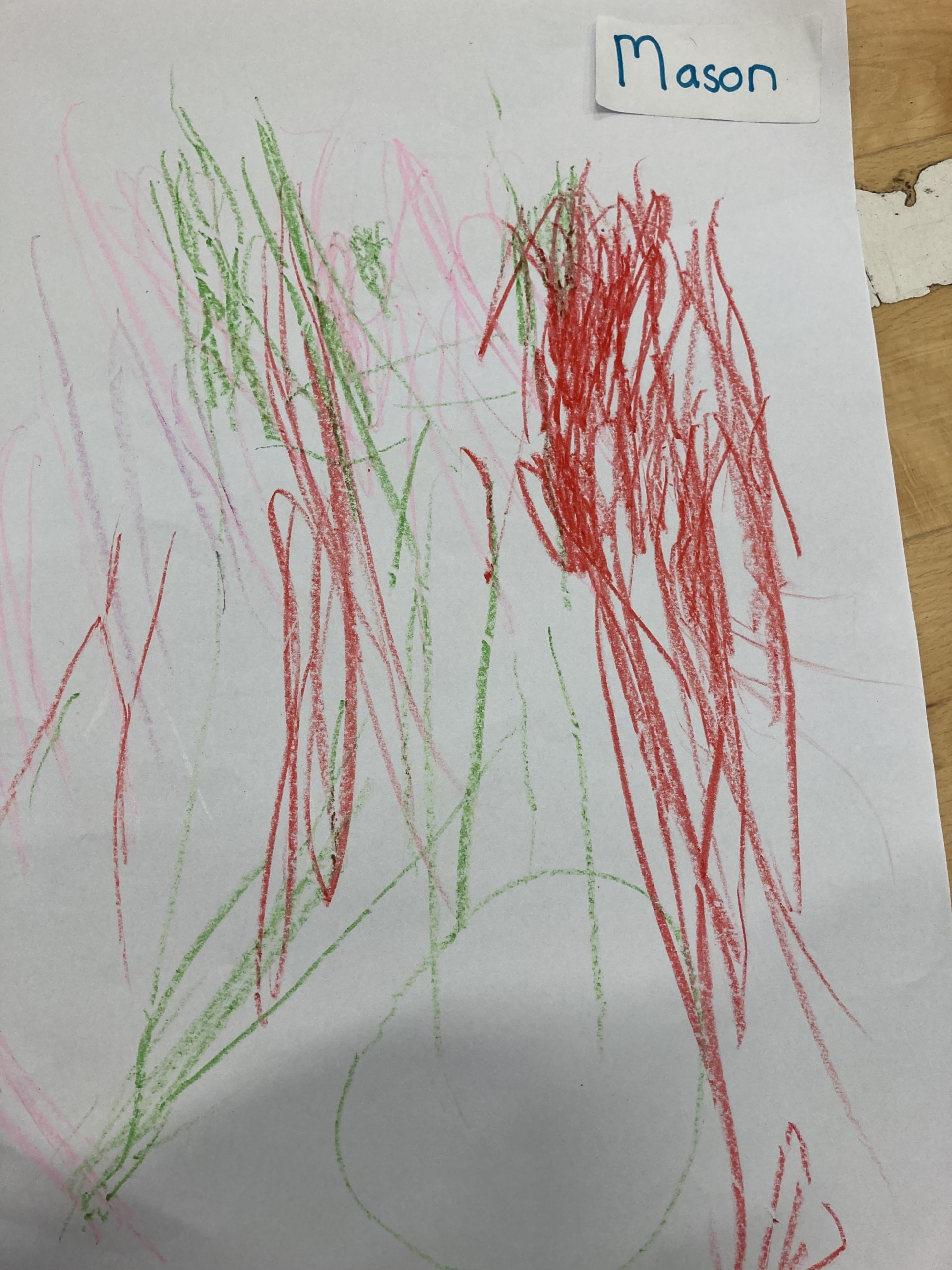 That’s purple shark, green shark, pink shark, family of sharks. Mummy shark is pink. They’re swimming in the sea. I was a shark. A scary shark. People were throwing sticks at the shark and they died. And then mum shark came and looked after them. I had a back like a shark.