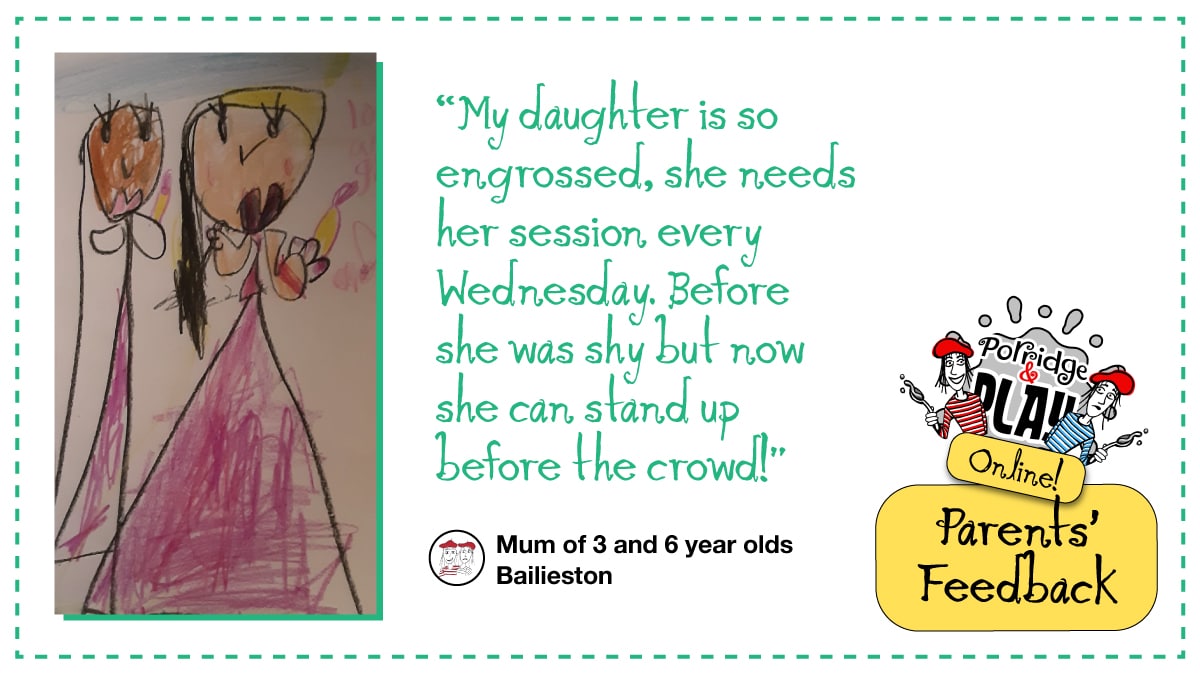 Since May 2020 Licketyspit has been working with 120 Glasgow Families three times a week through Porridge & Play Online. Big groups of families are meeting on Zoom to sing, dance, rhyme, joke, go on imaginary adventures and make friends. Thanks to Glasgow Council, Bemis and the Scottish Government, these 3 weekly Zooms can continue in January 2021 as part of Storyplay City.