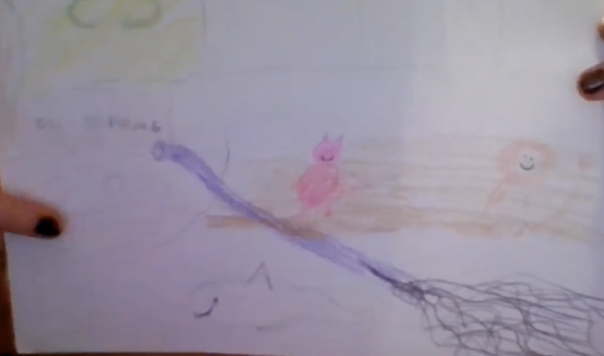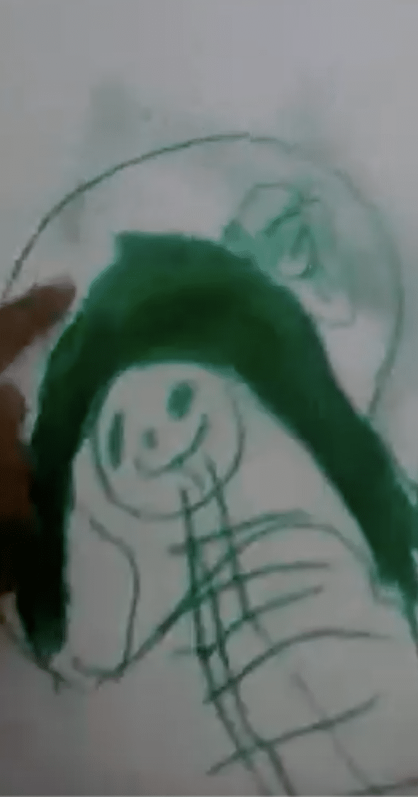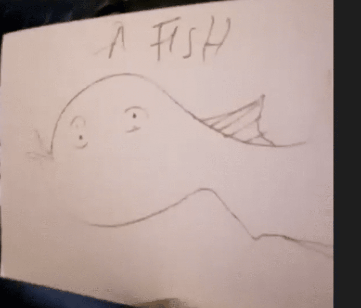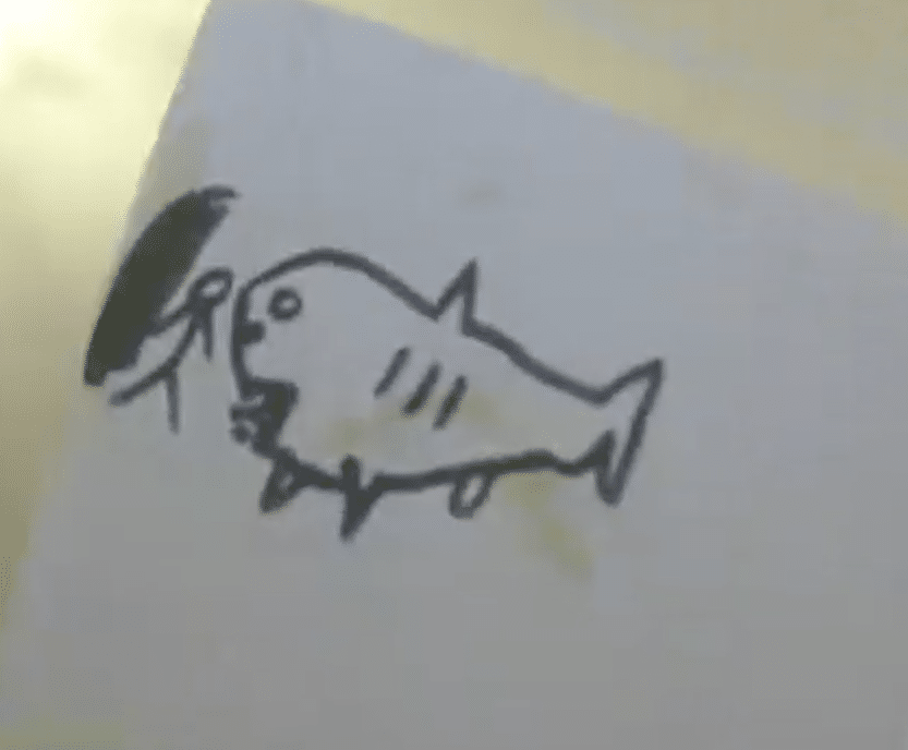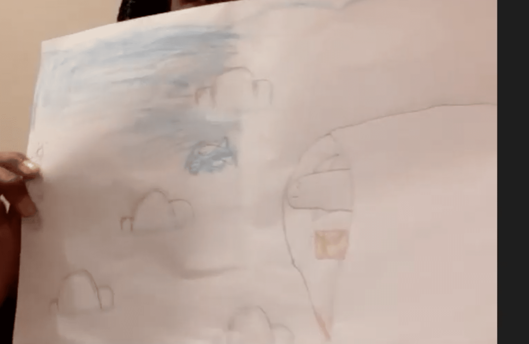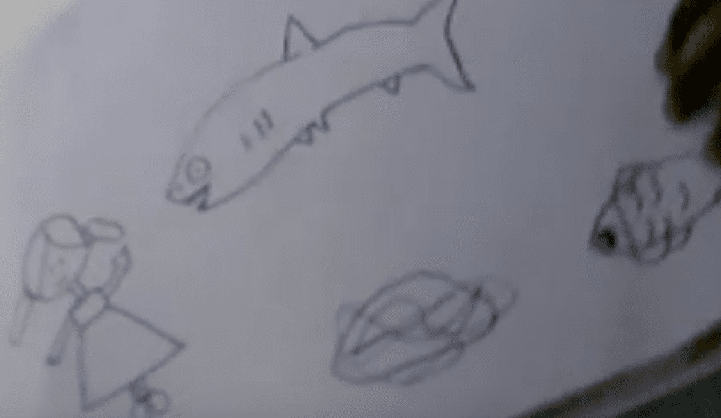 ‘ This is my drawing this is a shark and it tried to run inside a cave and it tried to get me. But, it can’t get into the cave because I’m really small so it can’t get in and my favourite part of the session is when we distracted the shark!’